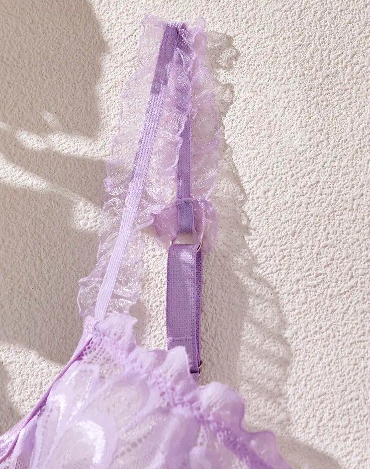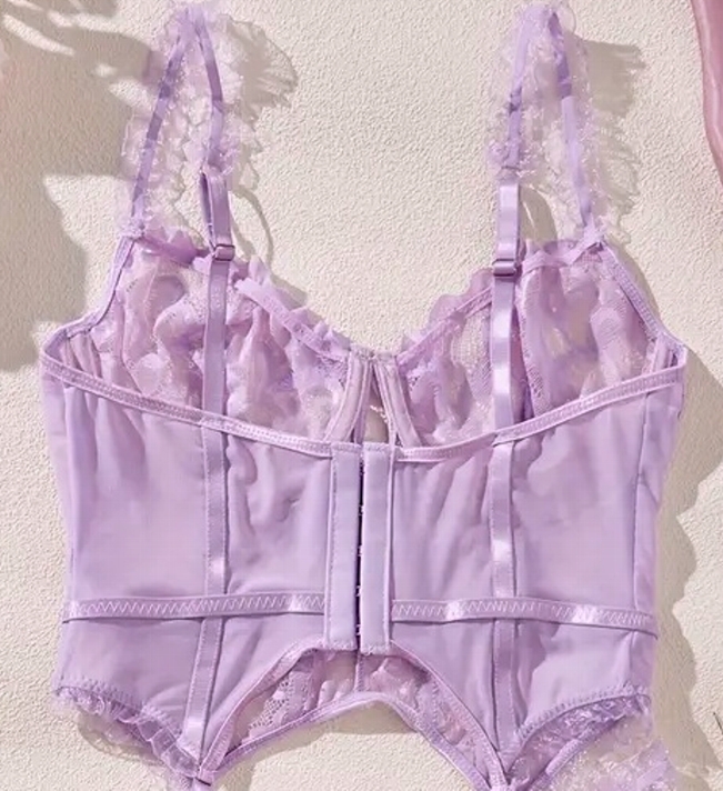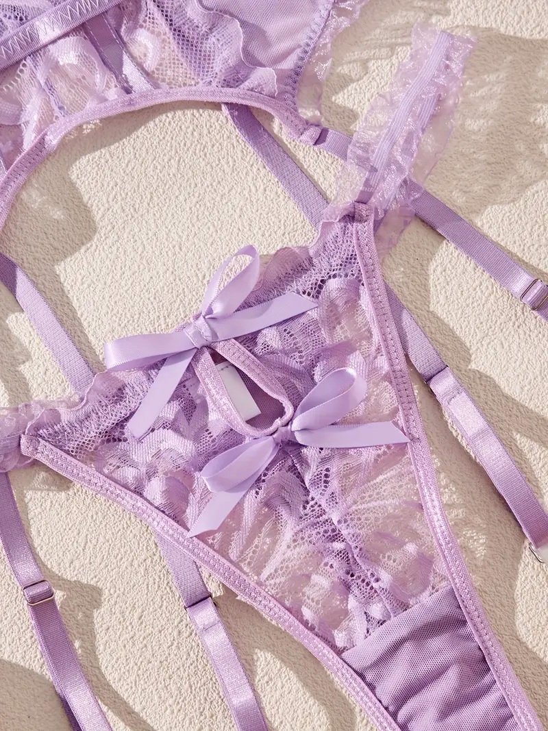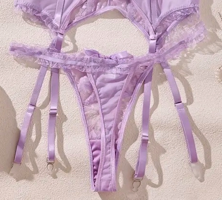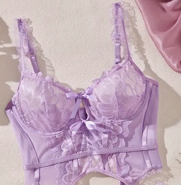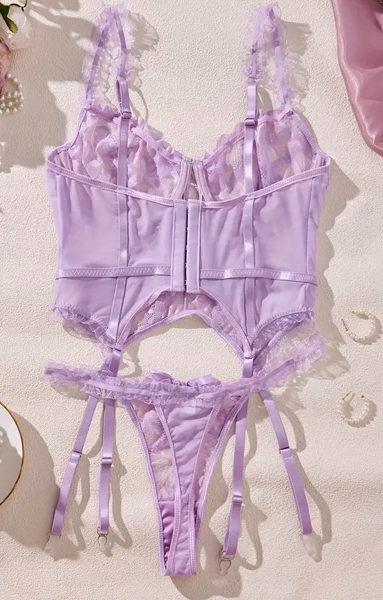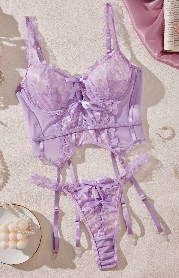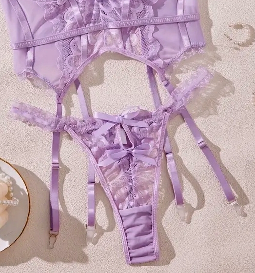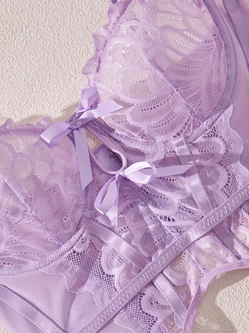 ◆ ラグジュアリー 美レース ボディースーツ(キャミブラ+ガーターベルト) ショーツのセット品 ライトパープル系◆