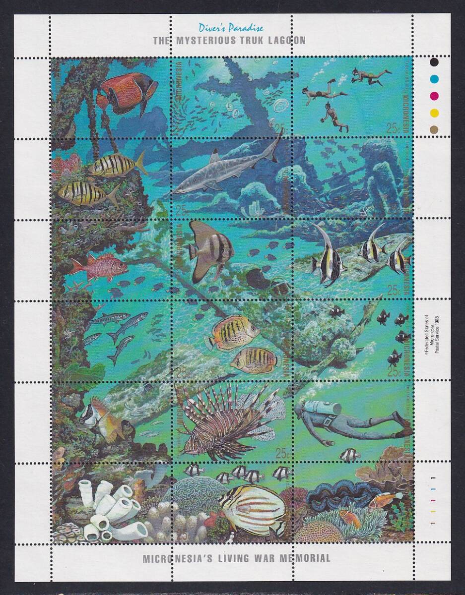 26 ミクロネシア【未使用】<「1988 SC#71 トラック環礁」 組合せ小型シート(18種連刷) >