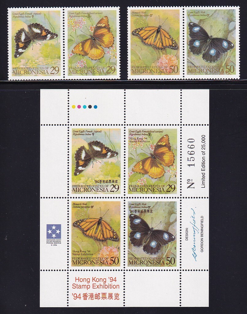 18 ミクロネシア【未使用】<「1993-94 SC#182-183,#190 蝶 / 国際切手展《Hong Kong'94》」 4種完(横ペアx2),組合せ小型シート(田型) >