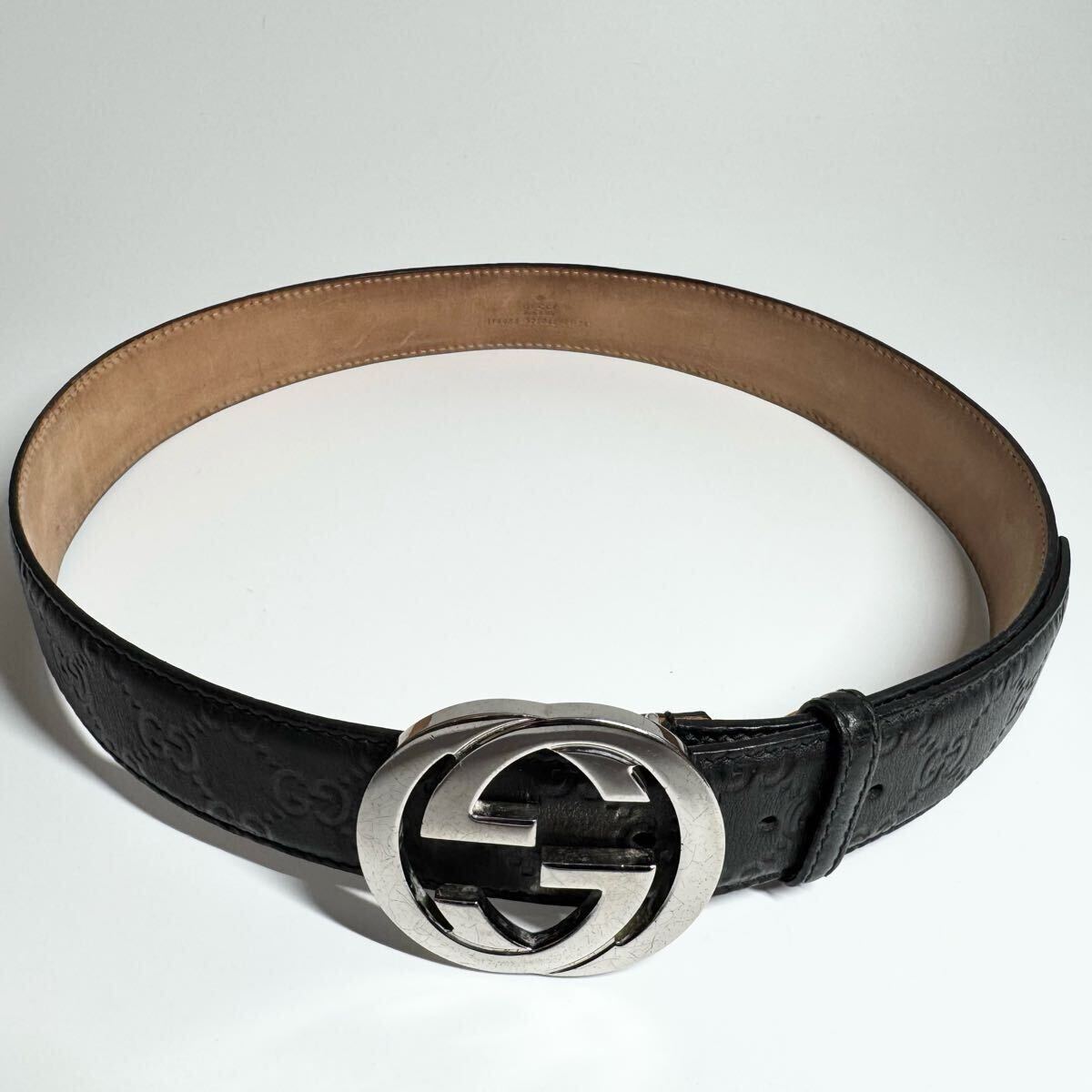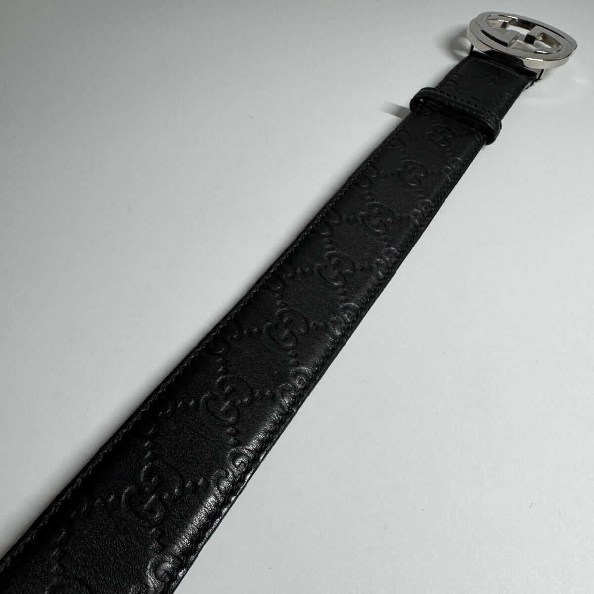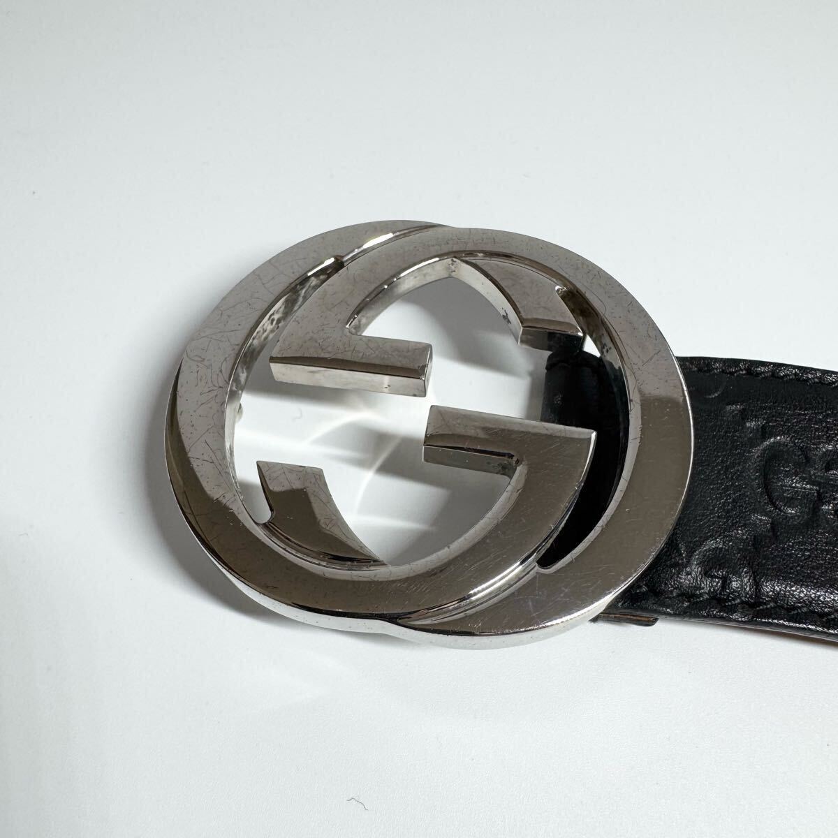 【美品】GUCCI グッチ ベルト インターロッキング デカロゴ シルバーバックル シマ GG柄 レザー 本革 ブラック 黒色 ビジネス メンズ