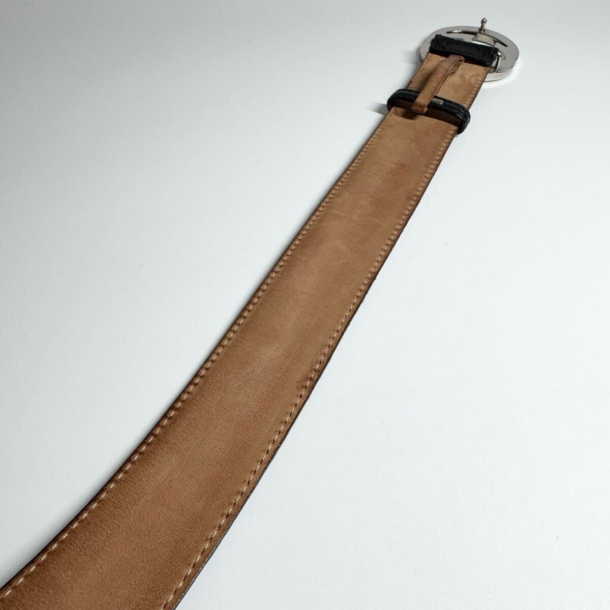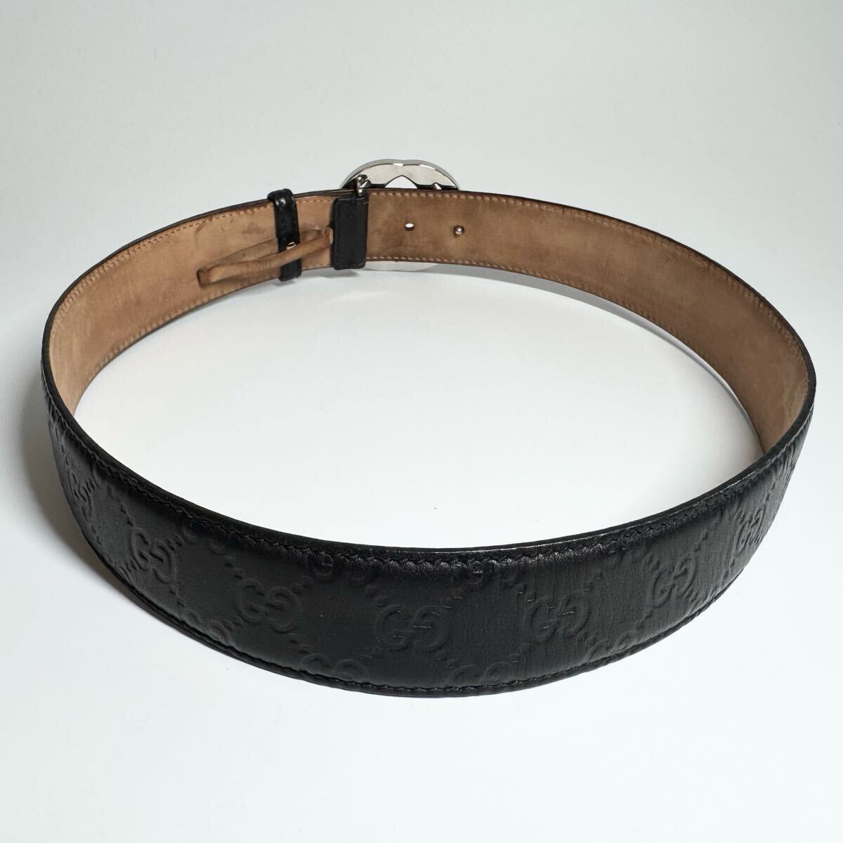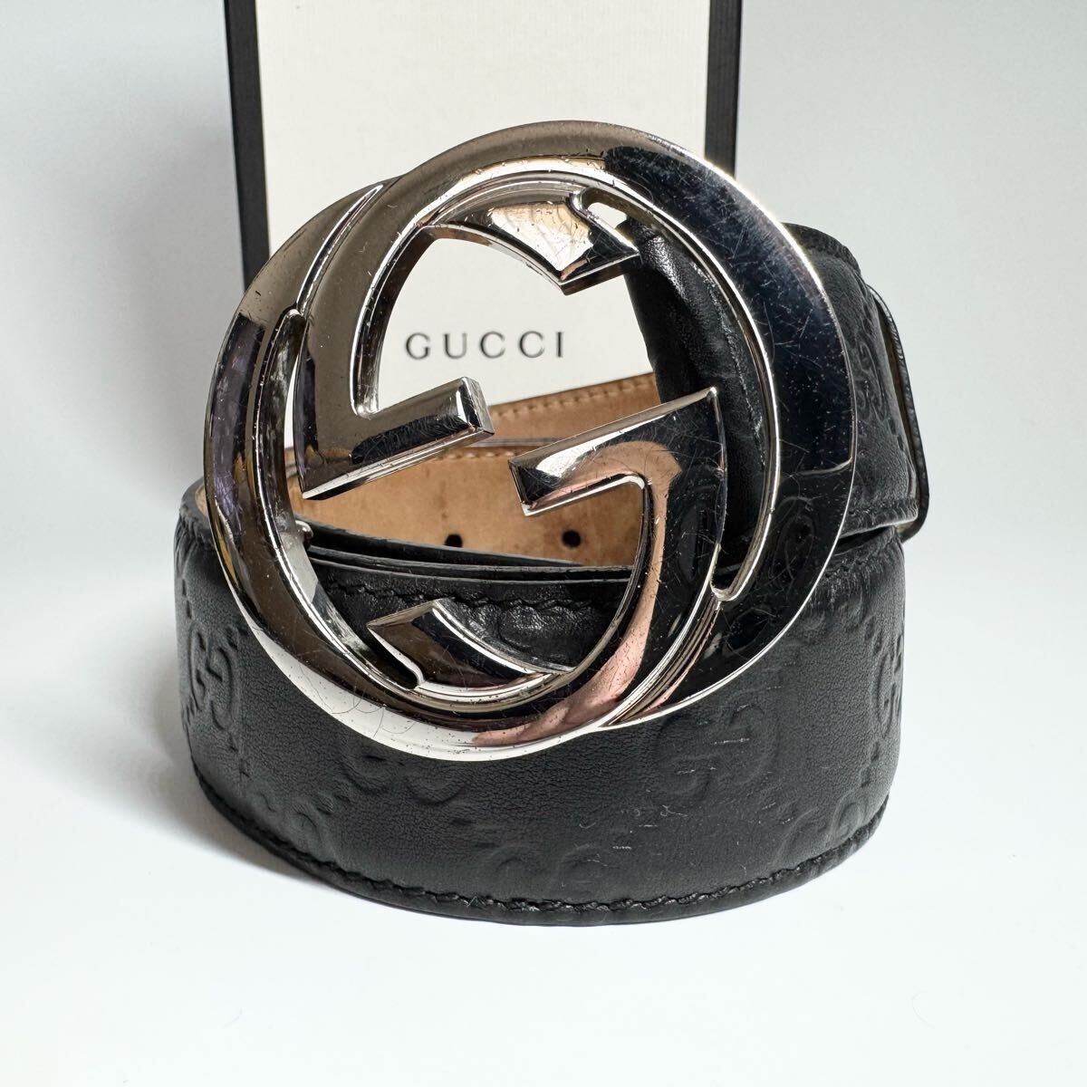 【美品】GUCCI グッチ ベルト インターロッキング デカロゴ シルバーバックル シマ GG柄 レザー 本革 ブラック 黒色 ビジネス メンズ