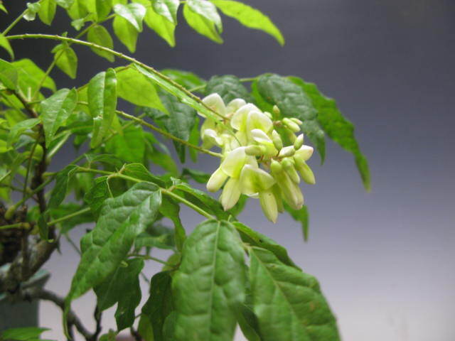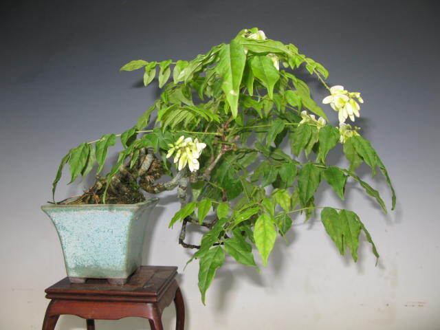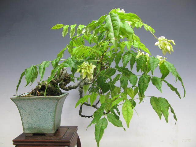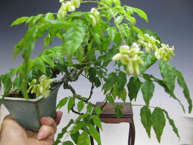 ★夏藤の小品盆栽です。夏の展示会に最適の樹種で真白の藤の花が綺麗です。本日撮影ですが暑い時期は花の命が短いので散っている場合がありますのでご了承くださいいる場合はご了承ください。