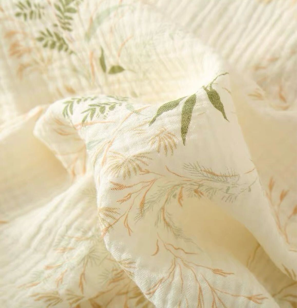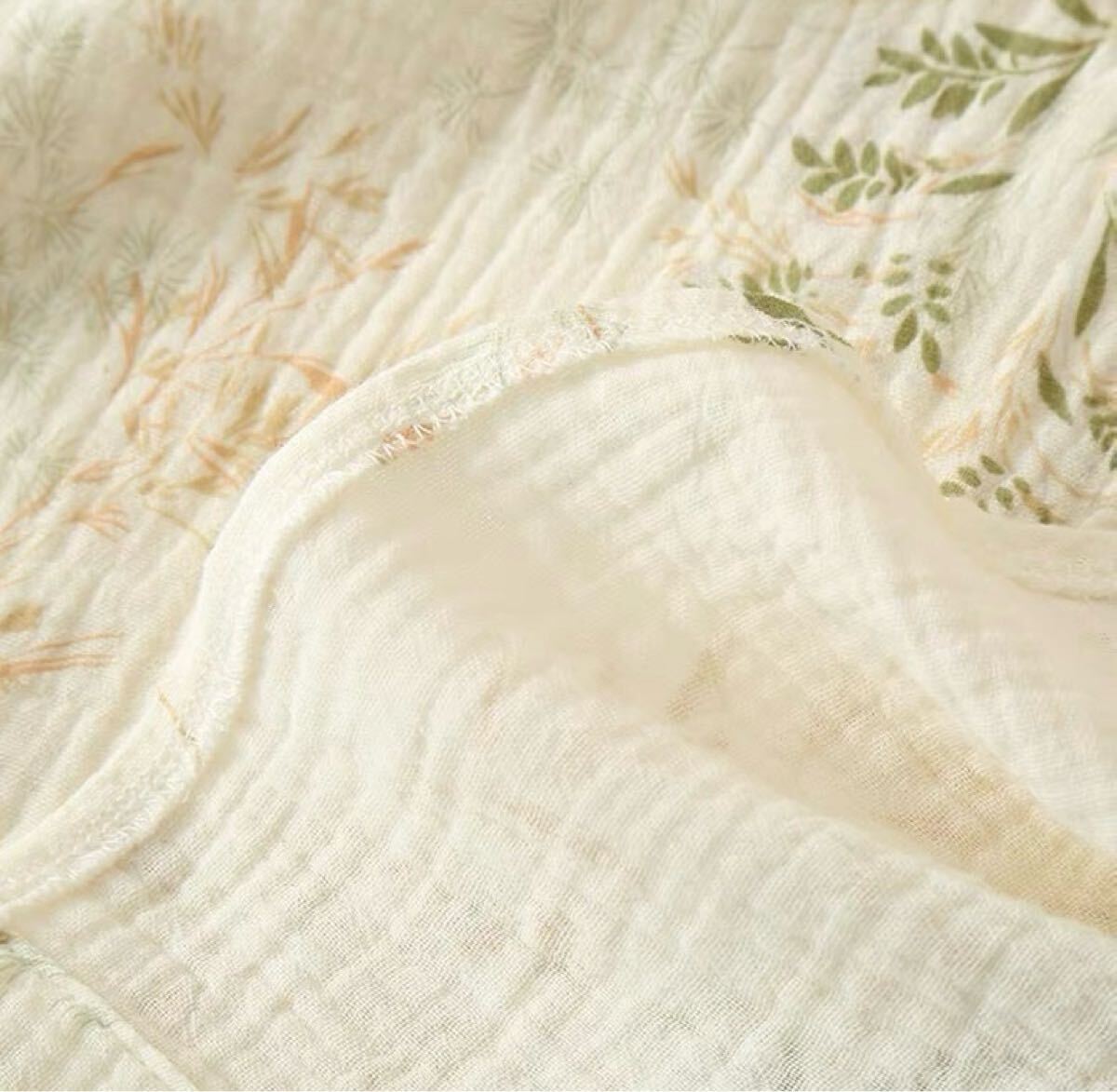 【ダブルガーゼ】薄い綿のガーゼを2枚合わせにした生地のことをいいます。生地と生地の間に空気の層ができることにより、保温性もあり寝冷え対策に適した素材です。