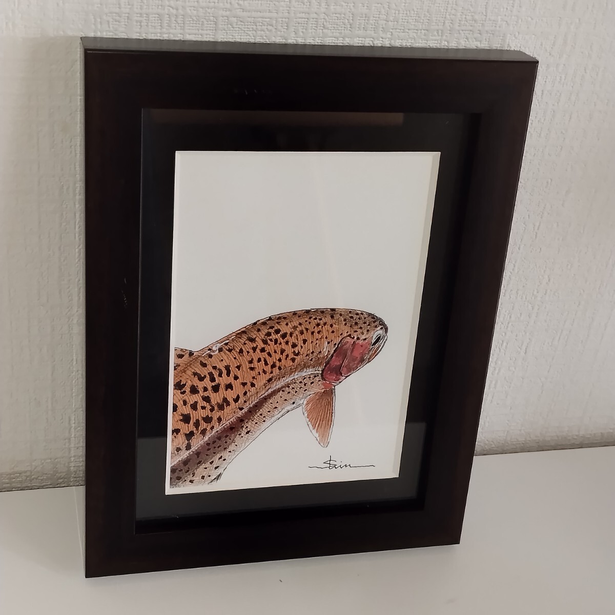 【真作、額付属】水彩画 夕日のニジマス 作:Shin