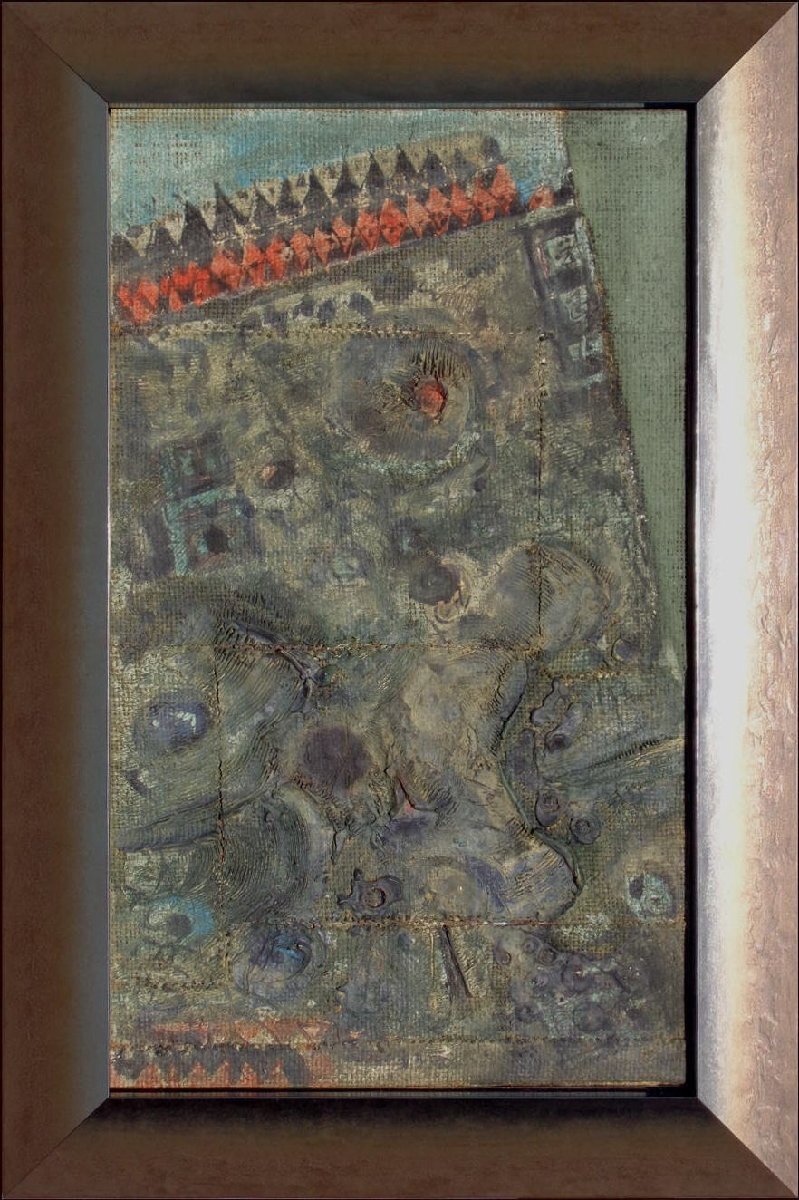 ◆出品~1965年作 『1965-1』 M 8号ドロ足付パネル+麻布(粗目)+石膏+油彩【真作保証】