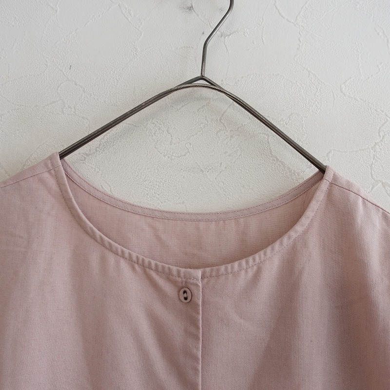 yubeshi×Samansa Mos2の切替2wayワンピースです。カラーはくすみピンクで、コットンリネンのブレンド生地で仕立てられています。前後どちらでも着用可能な2wayデザインで、ウエスト切り替えにタックがあしらわれ、両サイドにシームポケット付きです。