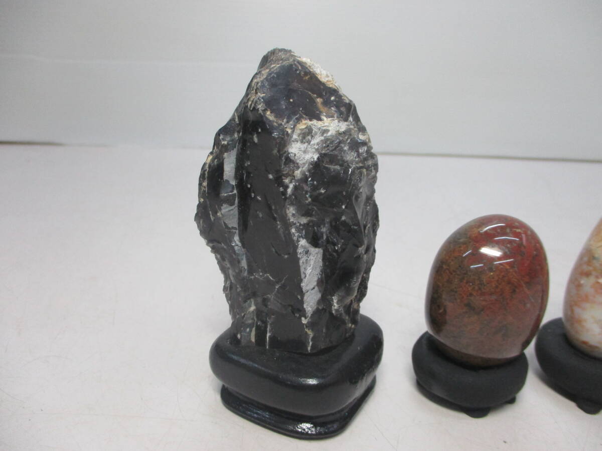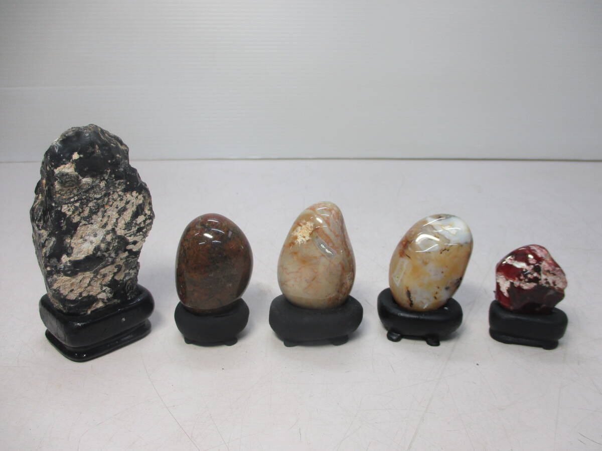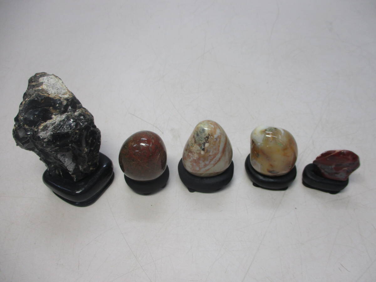 津軽 錦石 メノウ/黒曜石 青森県西海岸産 5点セット 台座付き