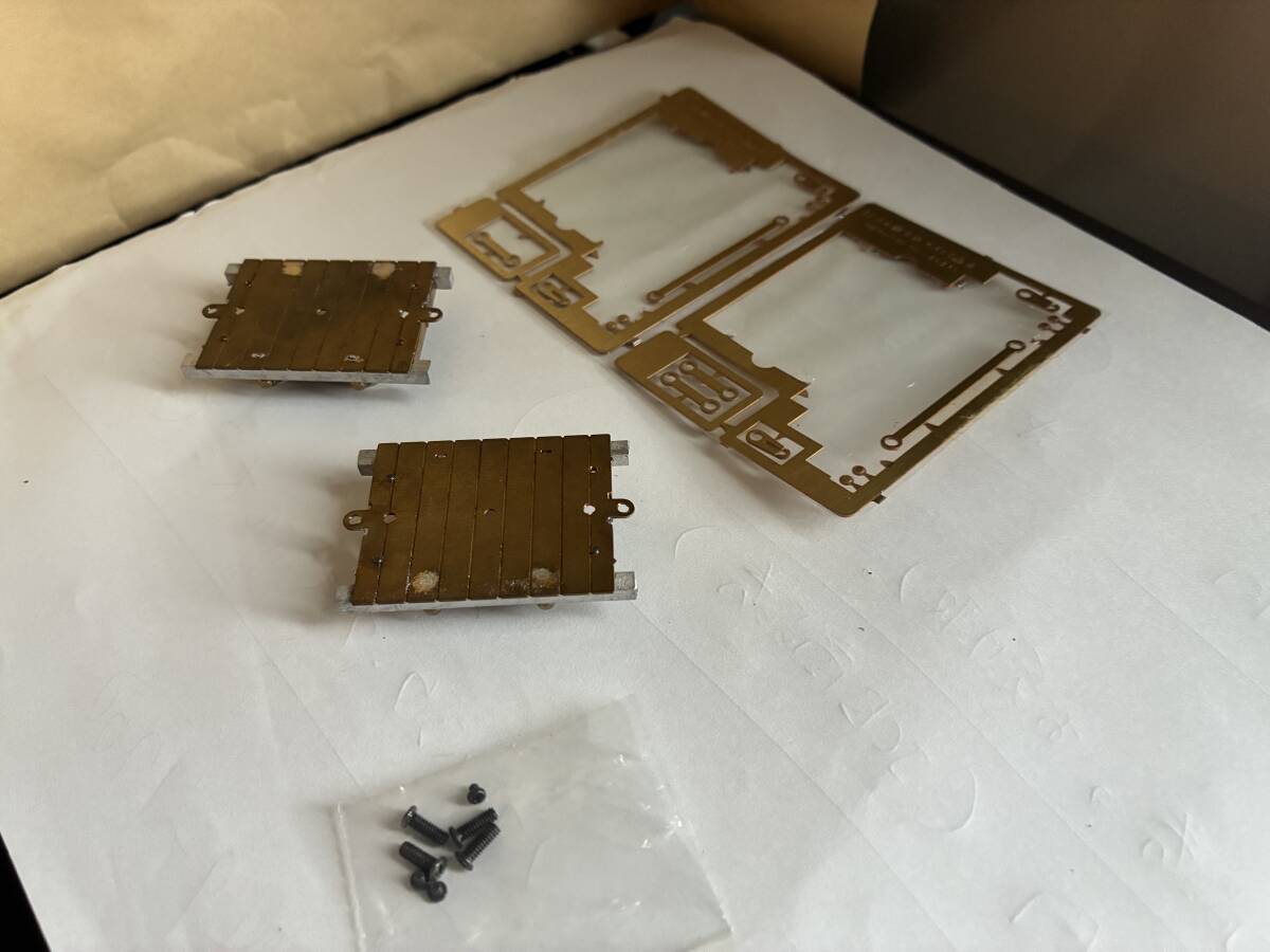 アルモデル製の平型トロッコの真鍮キット。ハンダ付け組み立て済み。未塗装。よく転がります。連結棒は長短2種類、連結器は長・短とも入っていてどちらかを選びますが、エッチング版から、取り外していないので、キットに付属しているボルトで連結する必要はあります。(写真参照)小さなボルトなどキットに含まれているものは付いてます。このトロッコの応用としてクレーンをつけるなどは、お好みで。親切な説明書が付いてます。美品です、NCNRでお願いします。