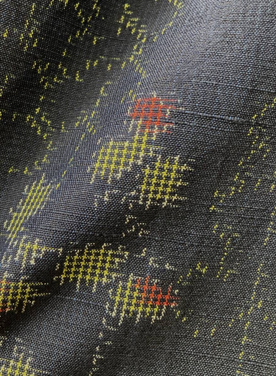 ✽鉄紺色(やや黒味がちな)を基調に菜の花色と朱色からなる真っすぐな花絵を縦にランダムに走らせたようなデザイン。