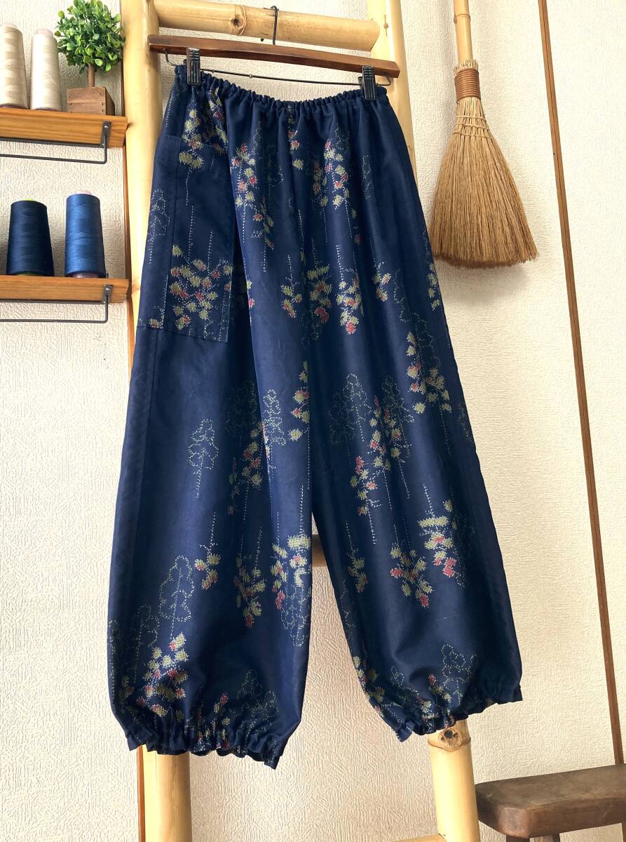 Product name: 鎌倉まるか堂 着物リメイク 紬 鉄紺に花流しのもんぺ風 ●絹 ●ゆったりまるっこいシルエット M~L●裾ふわパンツ●洗濯OK