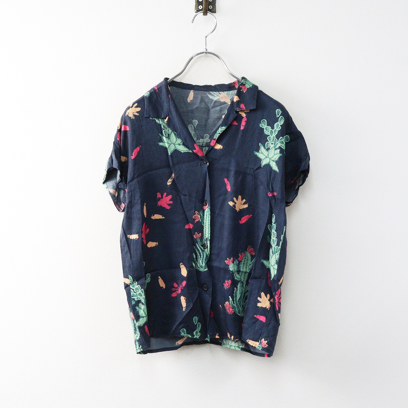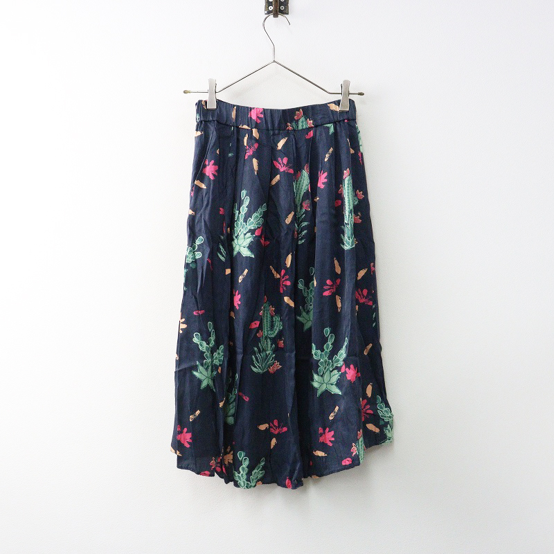 ルーニィ LOUNIE サボテン柄プリントブラウス スカート セットアップ 36\ネイビー 開襟 シャツ フレア ゴム【2400014612042】
