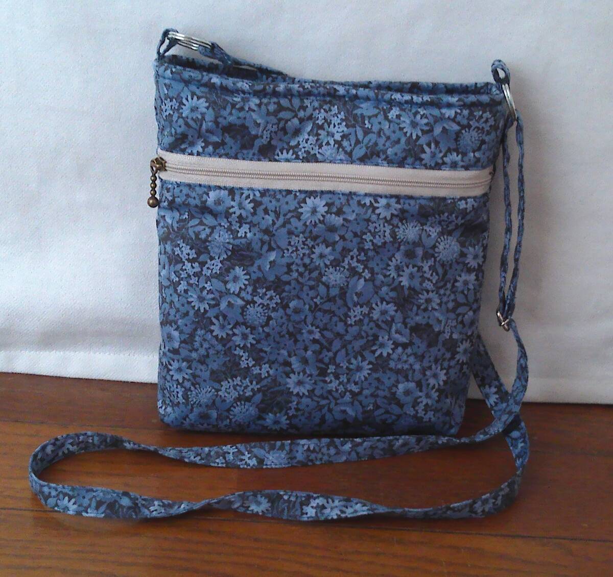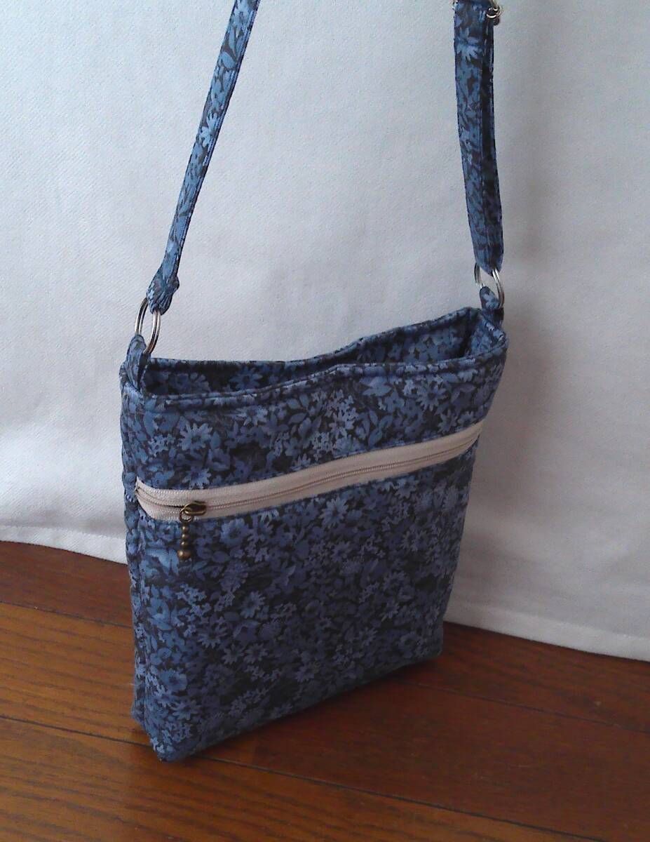 ★縦長ショルダー★紺地ブルー小花多花葉っぱ