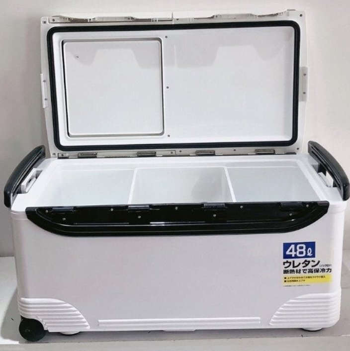Product name: 釣り用クーラーボックス 大容量 大型48L 座れる頑丈マッスルボディ 防水 サイドハンドル キャスター付 釣り 保冷力150h 水栓付き 白&銀