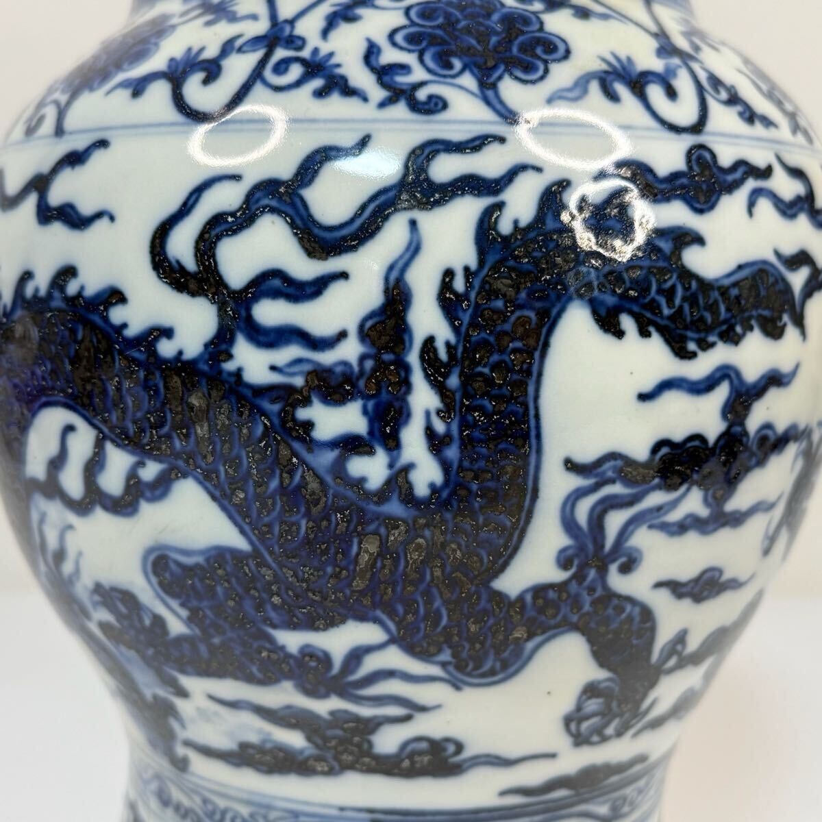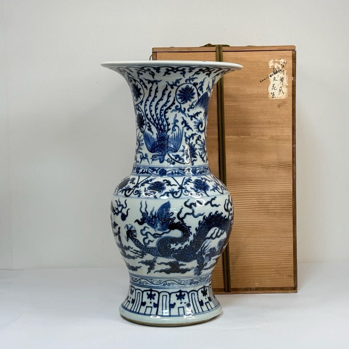 XMF-中国古美術 時代物 花瓶 花入 花器 花生 染付 花觚 龍鳳凰図 在銘 大明嘉靖年製 共箱付 唐物 陶磁器 骨董品 傷あり 幅27cm 高さ48cm