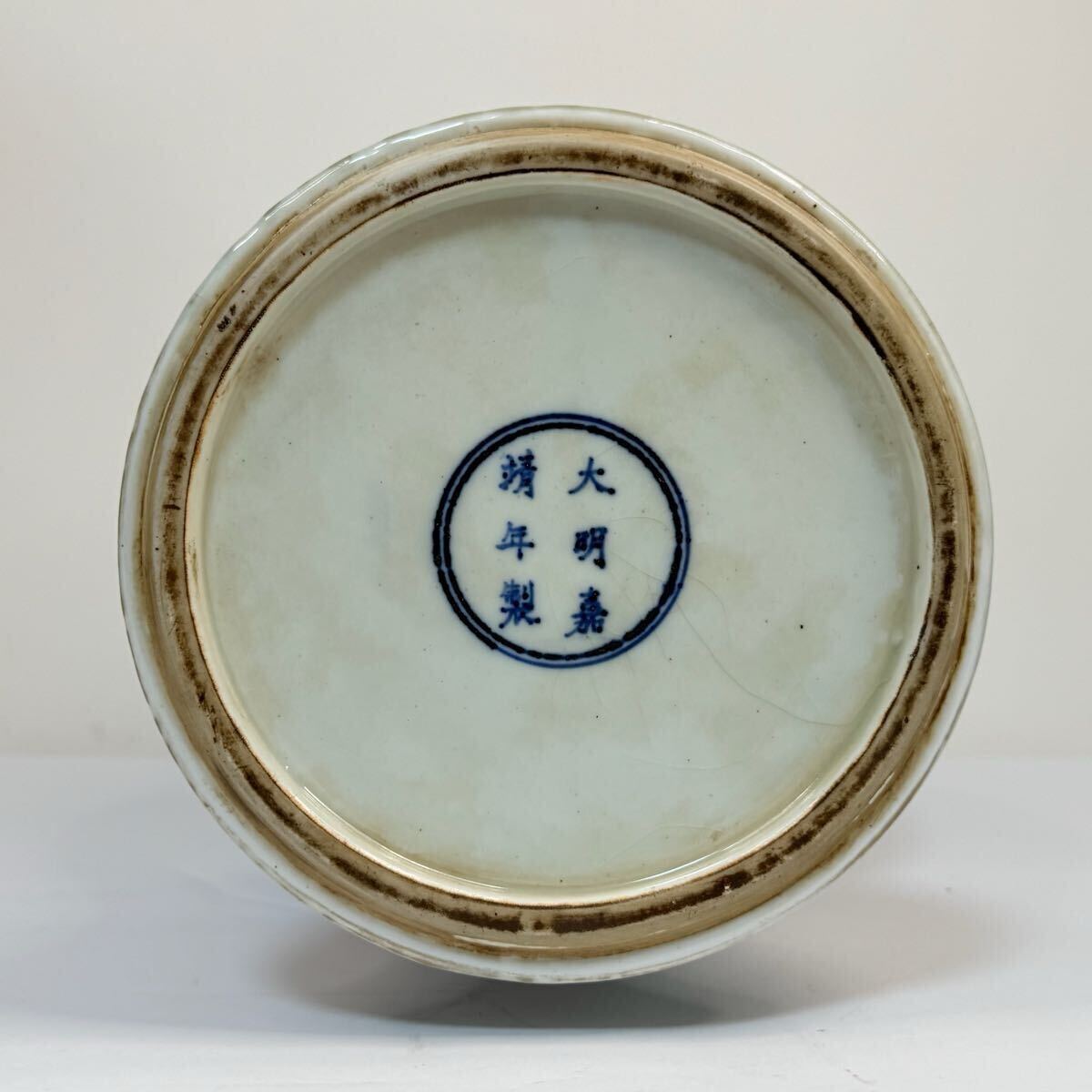 XMF-中国古美術 時代物 花瓶 花入 花器 花生 染付 花觚 龍鳳凰図 在銘 大明嘉靖年製 共箱付 唐物 陶磁器 中国古玩 骨董品 傷あり