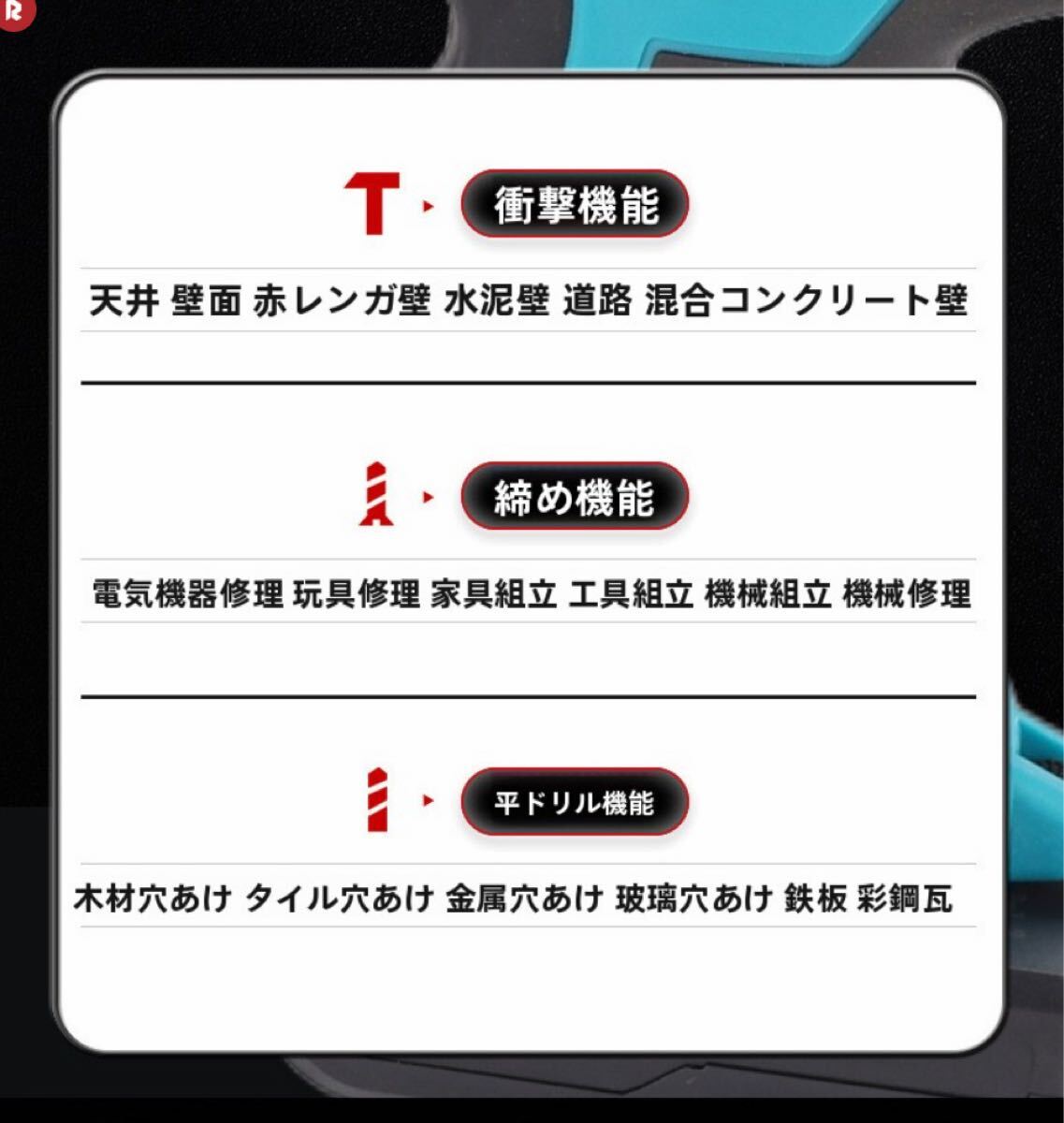 穴あけ、ネジ締め、振動ドリルの3機能が付いており、1台3役になります