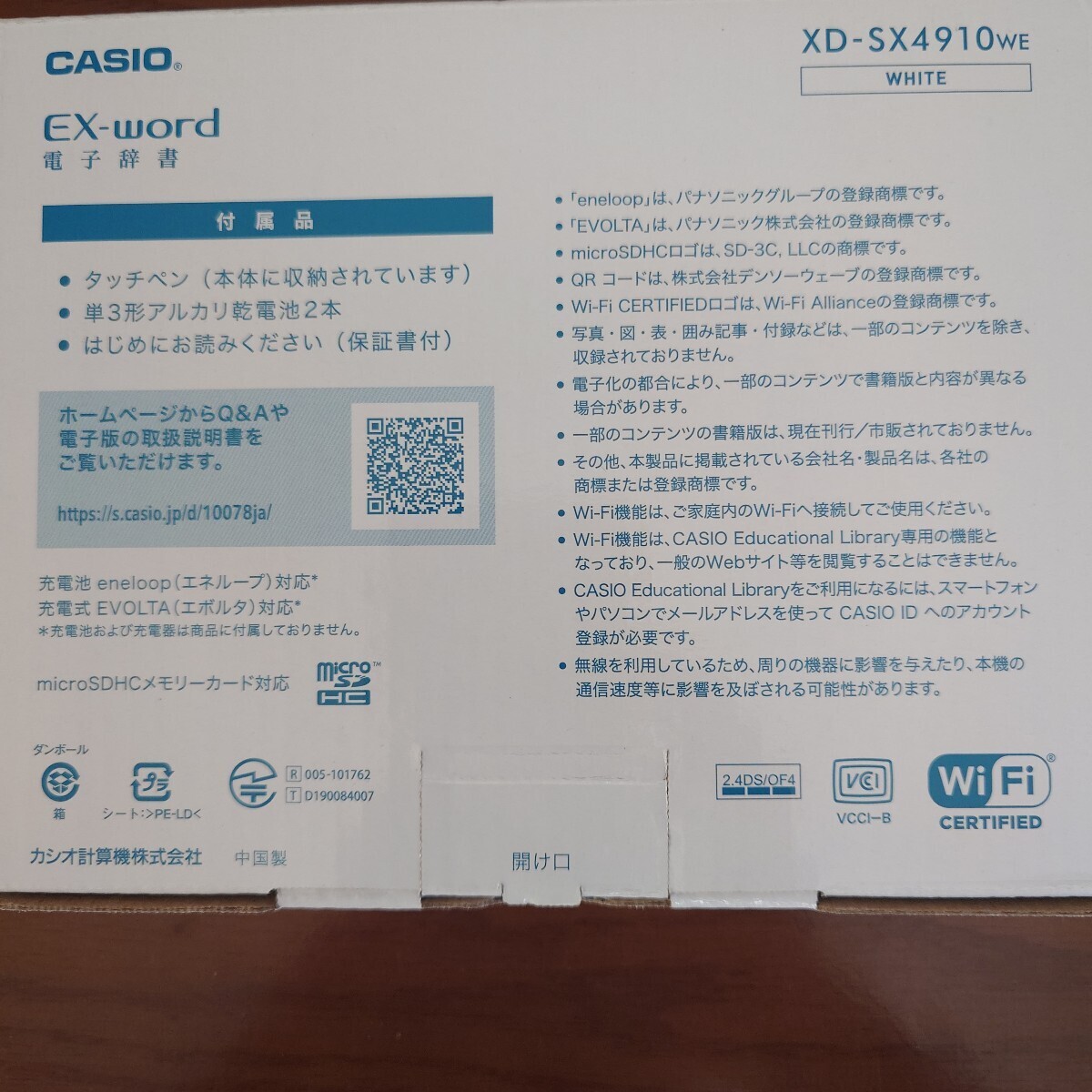 https://www.casio.com/jp/exword/product.XD-SX4910WE/ ★★★★★★★★★★★★★★★★★★★★★★★★★★  ★★★★    必ず読んでください。    ★★★★ ★★★★★★★★★★★★★★★★★★★★★★★★★★ ●落札者は10月30日木曜の夜8時迄に決済を行って下さ       い。 ●同梱は10月29日水曜の朝8時迄に連絡を下さい。  それ以降は手数料350円頂きます。これは大量に落札し  て  いたずらが見受けられたためです。 ●なお、落札して48時間を越しても決済、連絡がない場   合は落札を落札者の都合として取り消しとします。 ●不明な点は遠慮なくお問い合わせ下さい。 ●新古品の為に保証サポートは一切、受け付けていませ           ん。 ●同業と思われる方や個人的と思われる方の個人的な取り     引きを持ちかける方が居ますがスルー対応、もしくはブ    ロック致します。 ●旧製品の為、リチウム電池に関する不良品の返品はいた    しません。 ●以上を踏まえてご理解を頂いた方のみの入札をお願い    し、また入札をされたと対応を致します。