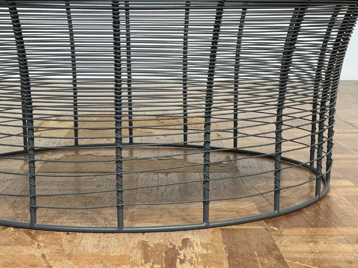 粉体塗装を施した上質なスチールワイヤーをプロダクト下部に移ろうにしたがって用いる本数を減らすことで、天面に軽やかな浮遊感を演出した理知的な構成で、芸術品やオーナメントのような美しい見応えを放つ、インテリアからエクステリア、テーブルからラック、スツールまでマルチに活躍する多目的テーブルスツール。Cassina ixc. / GAN より。