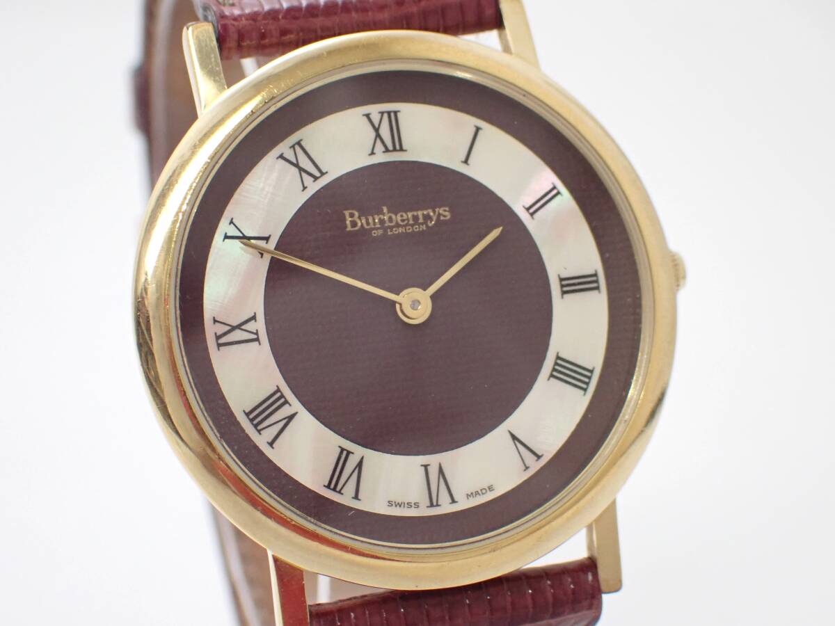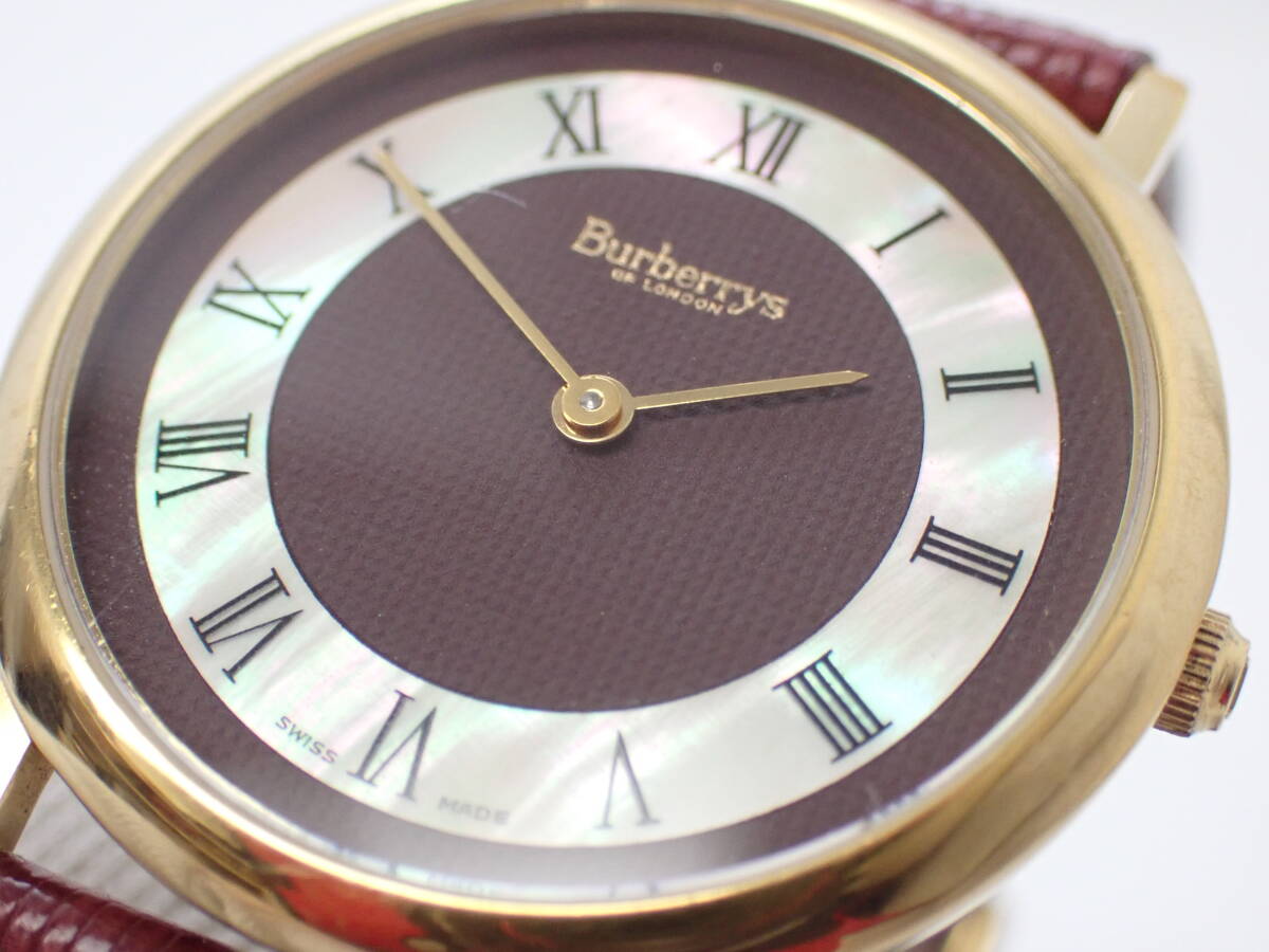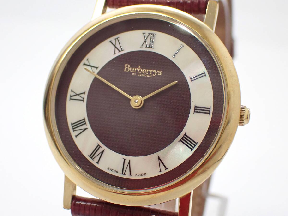稼働品 1円~☆Burberrys バーバリー QZ メンズ腕時計 シェル文字盤 6000G ラウンド アナログ ゴールドカラー 革ベルト/角107-200