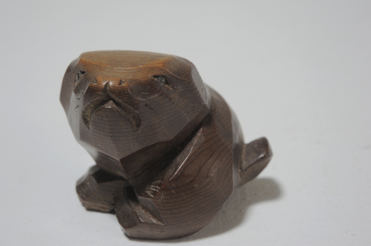 櫟一刀彫 狆 子犬 根付 一彦 銘 仔犬の木彫り 提げ物 大正 戦前  古木彫 古道具 民藝  folk art フォークアート 郷土玩具