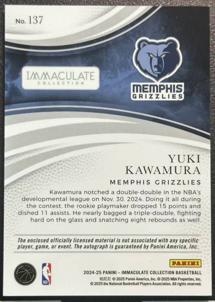 Product name: 河村勇輝 Kawamura Yuki Panini Immaculate 2024-2025 /99 RPA RC Patch Auto サイン 直筆 グリズリーズ Grizzlies