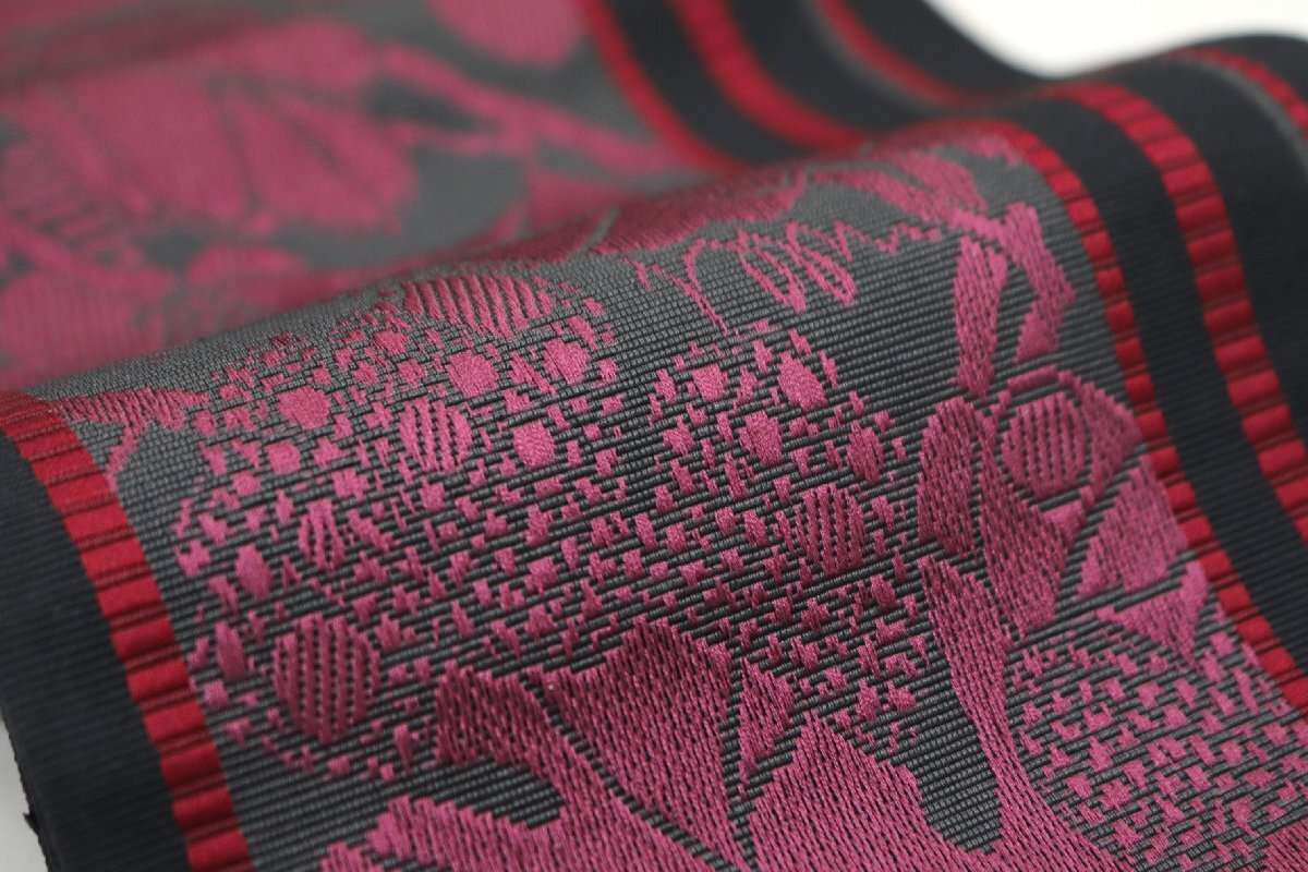 しなやかな織りの帯地は、黒色、浅い黒色、臙脂色で縞が織り出されおり、そのなかには植物模様が表現されております。