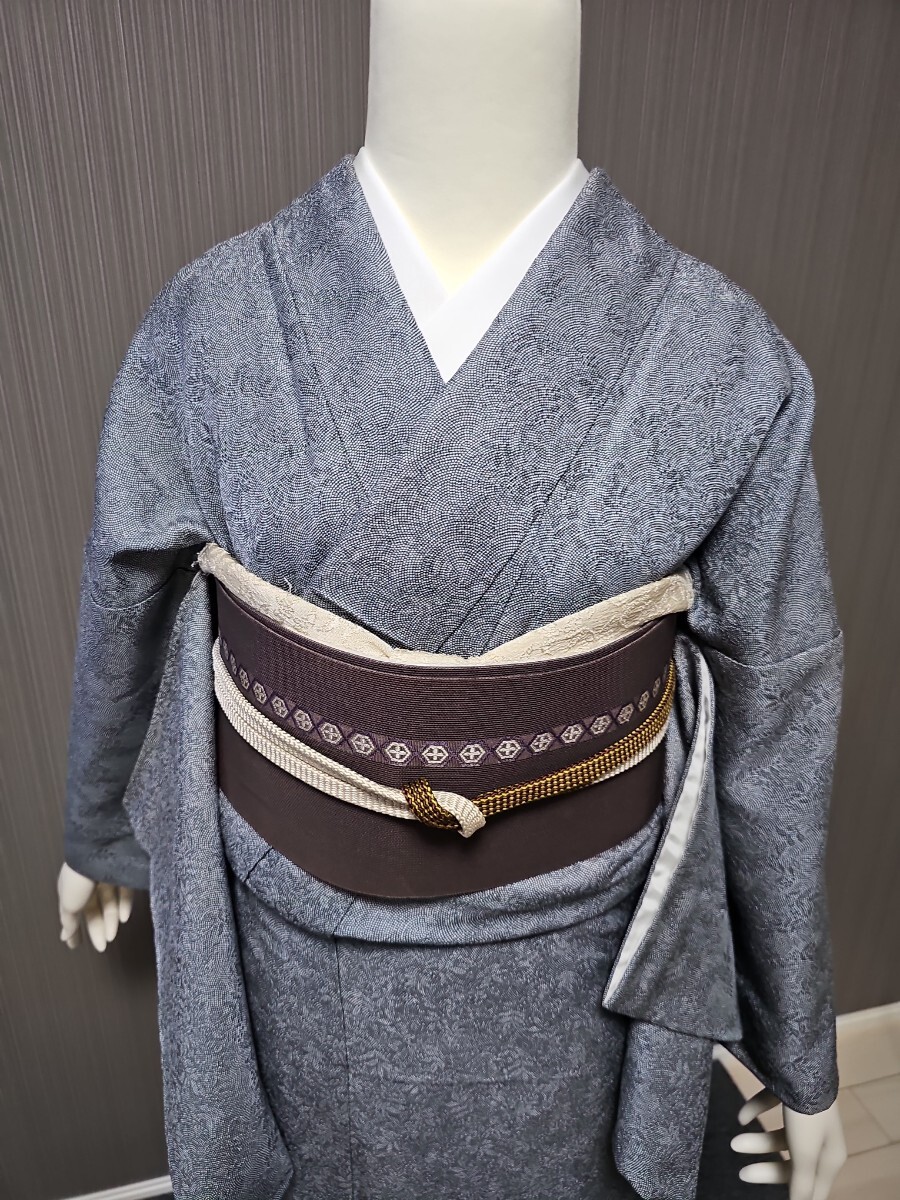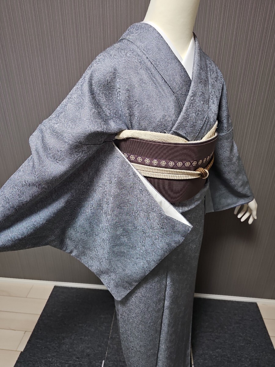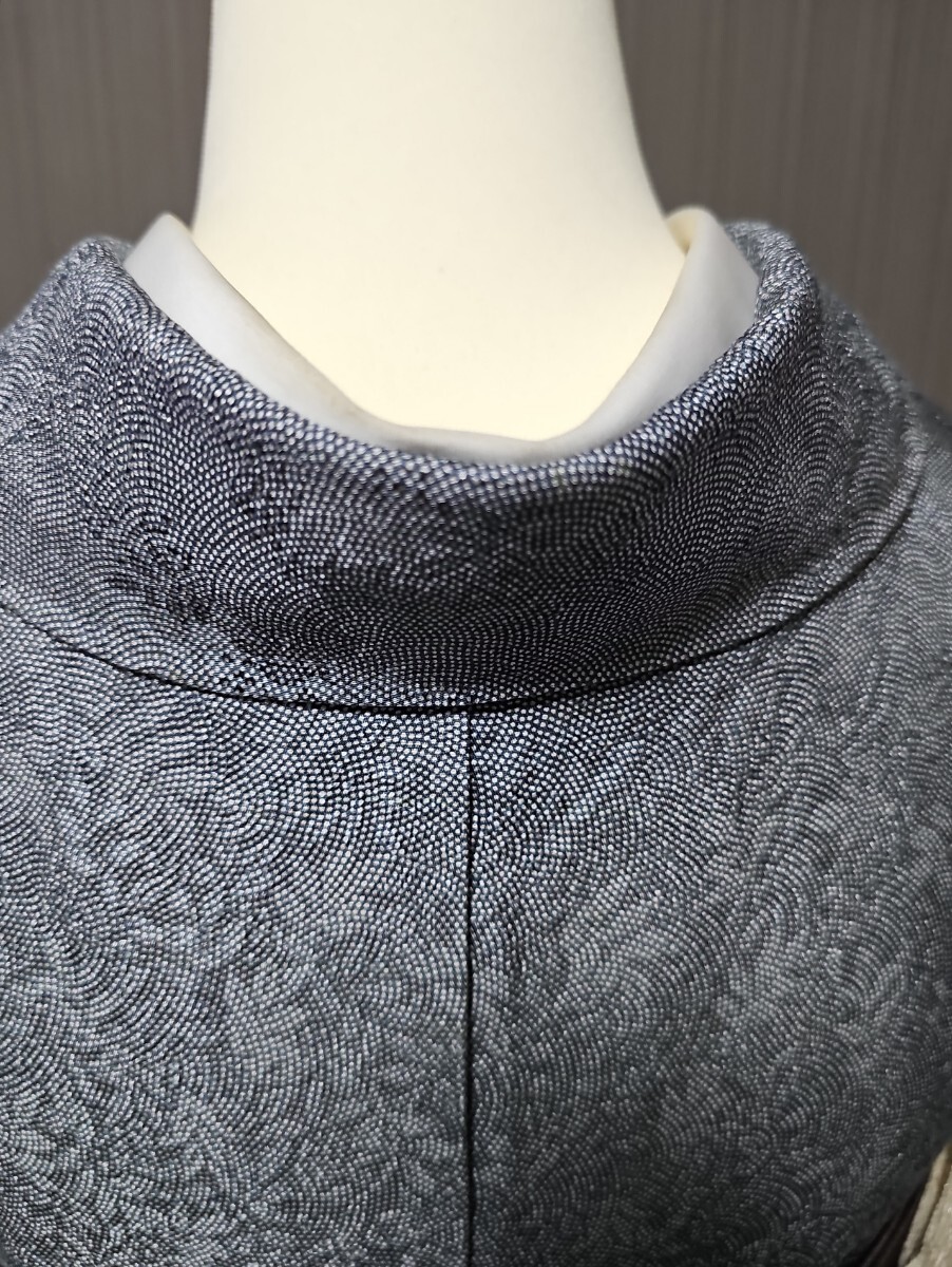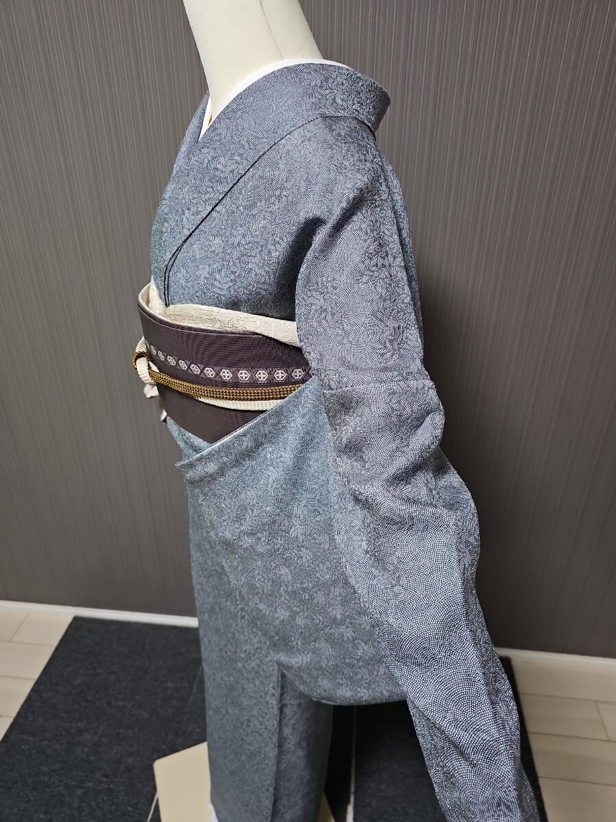 ★滑かな上質縮緬生地、青灰系、花葉織地文様に鮫柄を染め上げた様子が気品有る雰囲気を醸し出す上等なお召し物でございます。