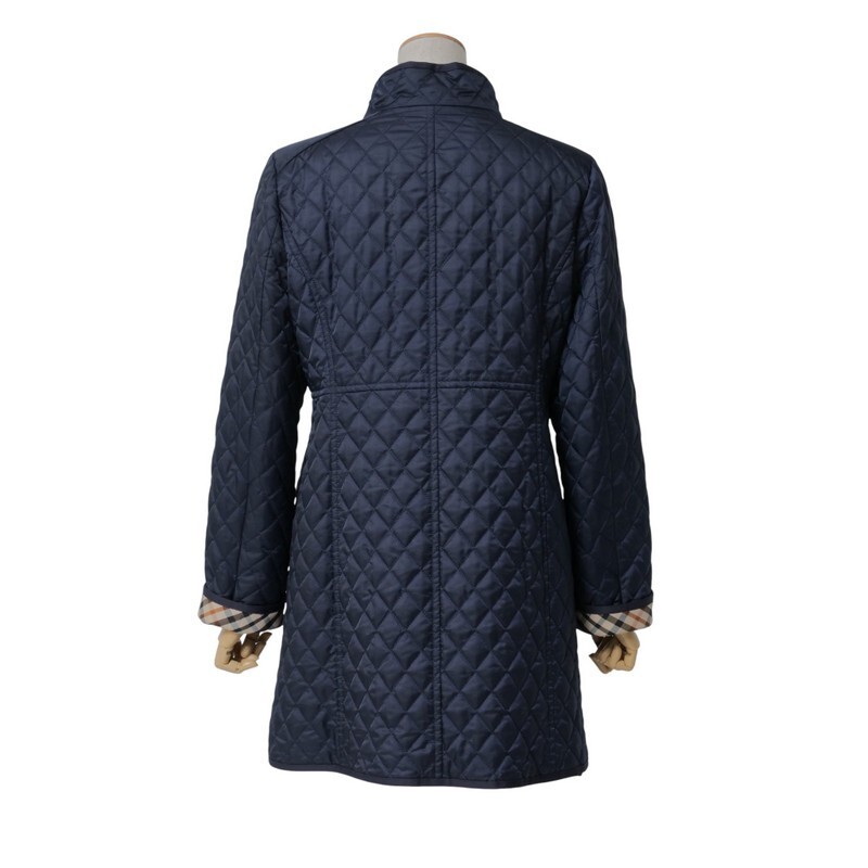 裏地のチェック柄がブランドらしく、中綿入りで軽やかながらも保温性に優れるキルティングコートです。