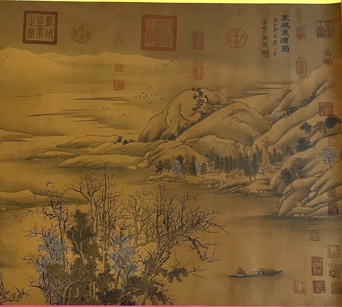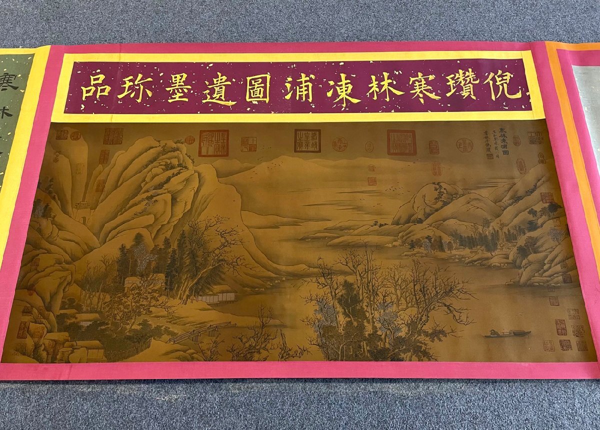 Product name: 【安】中国元時代画家「倪ザン書」絹本「寒林凍浦図長巻」巻き物 共箱 中国画 墨寶妙品 中国書道 古美術 410