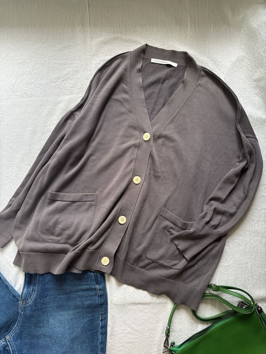 フレームワーク Vネック ビッグカーディガン 定価¥17600 カラー チャコールグレー サイズF ワイドシルエットです。 コットン素材でロングシーズンお召し頂けます。 サイトよりFRAMeWORK◆大HITのカーディガンが素材をリニューアルして登場!!ワードローブにあると安心、こなれたシルエットのBASICカーディガン。昨シーズン大好評のデザインにアップデート。自宅でケアができるコットン100%素材はデイリーユースにぴったり!!羽織るだけでサマになるゆったりとしたシルエット、あえてはぎ目を目立たせたデザインや大きめのボタンなど、シンプルながらもちょっと気の利いたしゃれ感のある一枚。