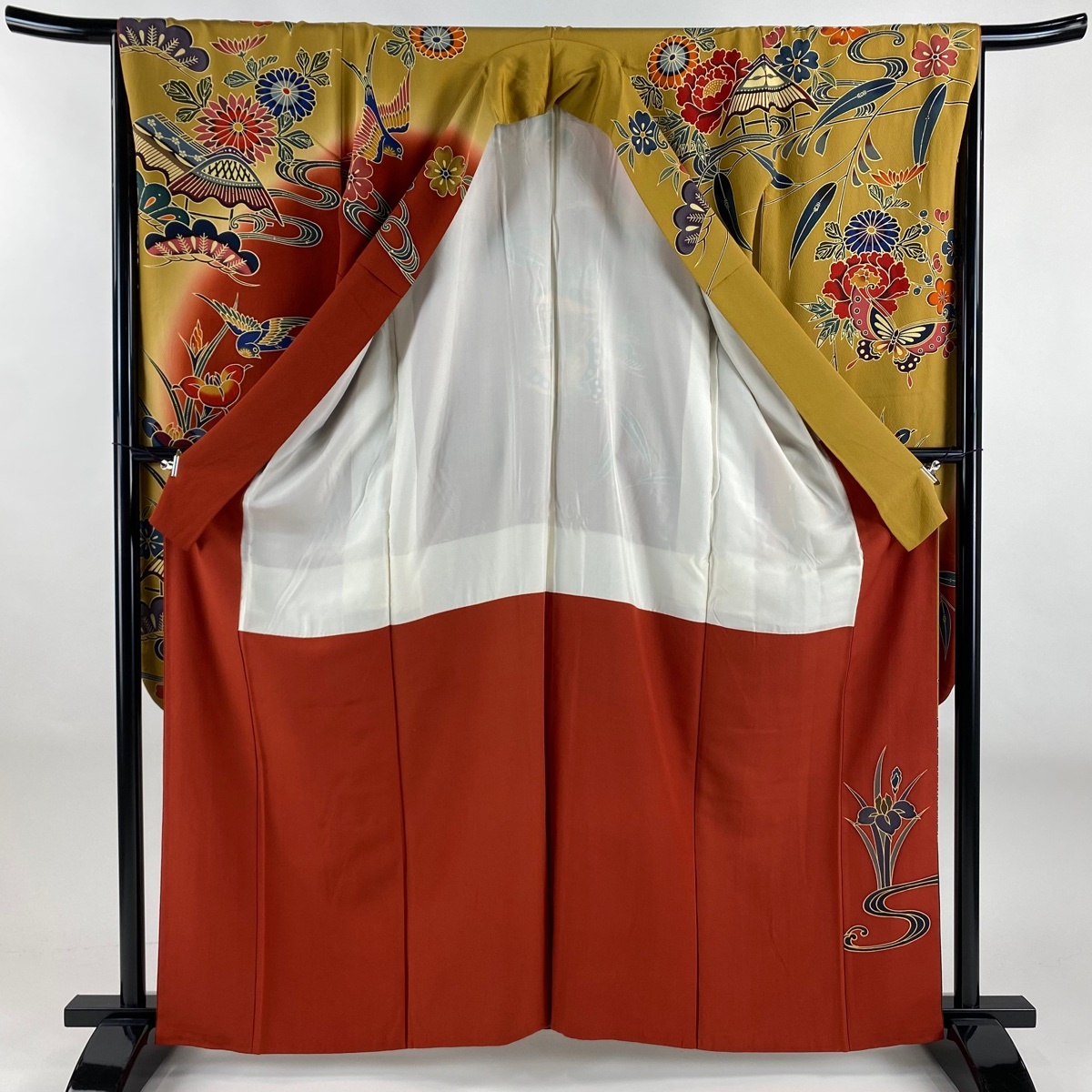 振袖 秀品 落款 宮崎良次 家屋 草花 染め分け ぼかし 山吹茶色 袷 身丈162 裄丈66.5 M 正絹 【中古】