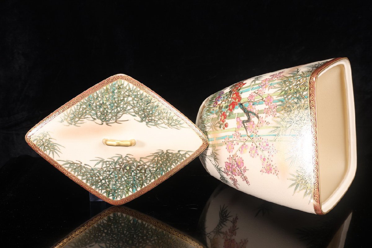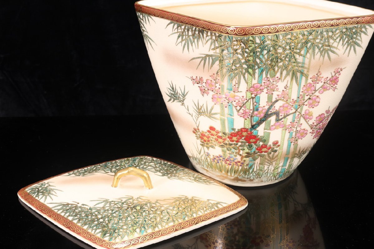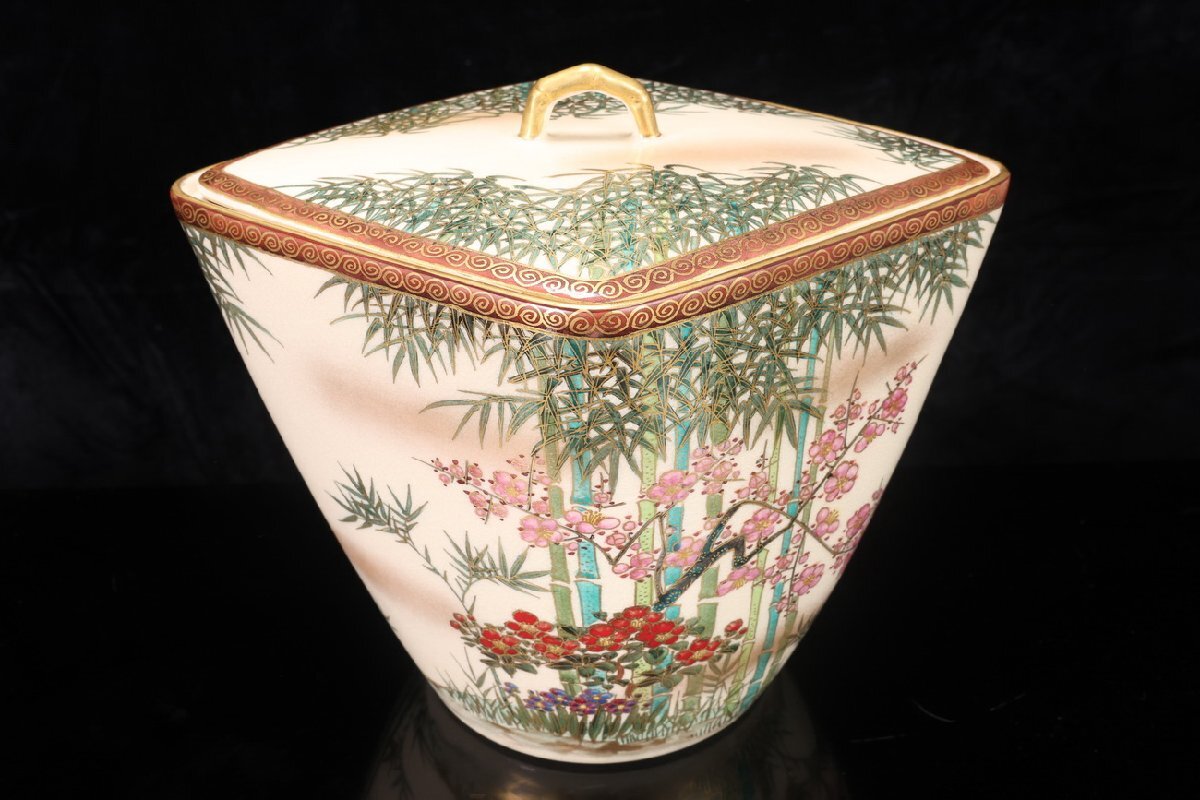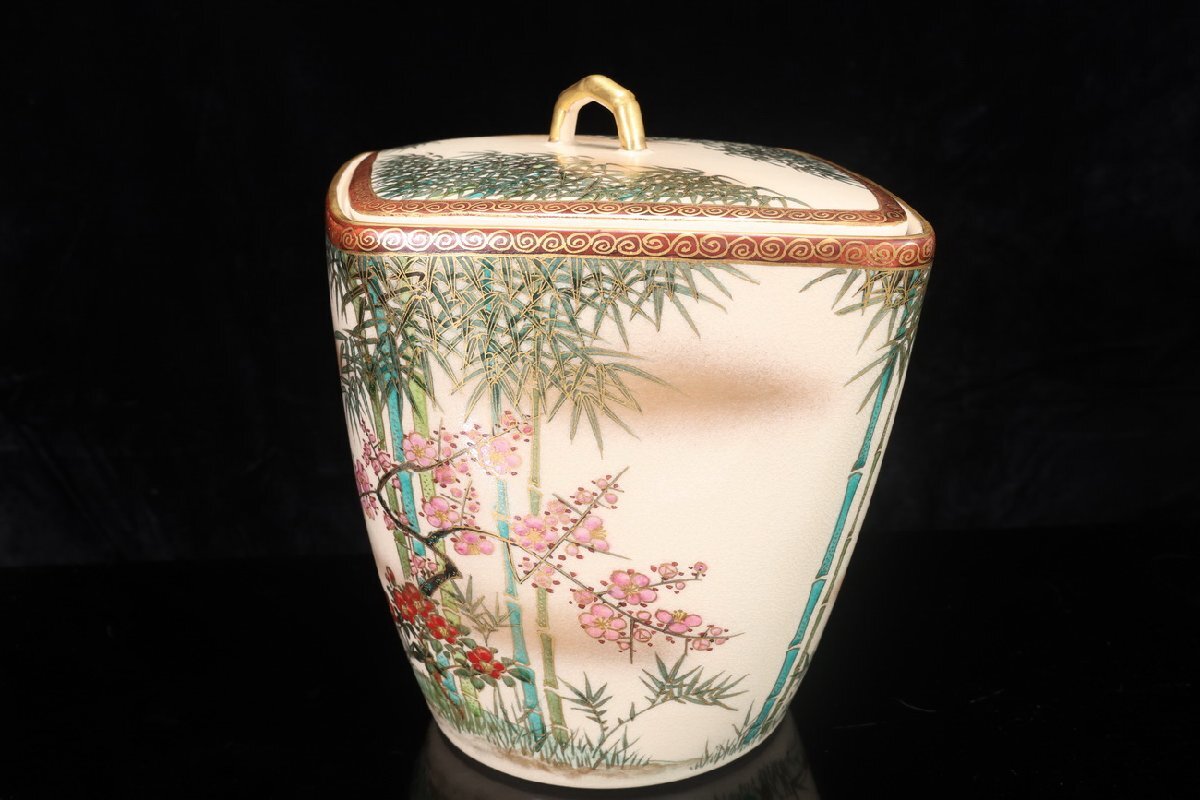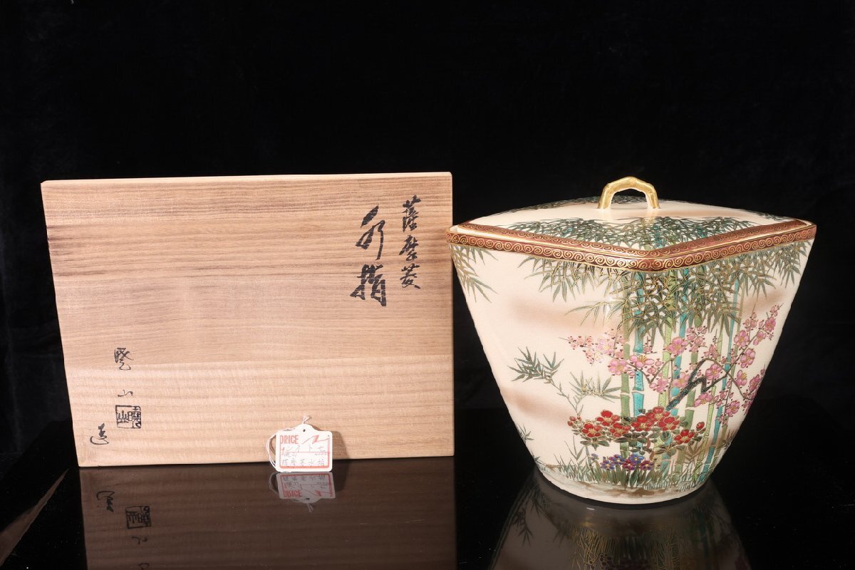 Product name: 【珍品堂】1円から P80-V14 薩摩焼 薩摩菱 暁山 作 在銘 繊細 金彩 色絵 竹草花図 蓋付 水指 高20㎝ 絵花瓶 茶器 茶道具 共箱 木箱 骨董品