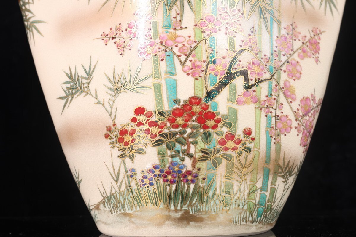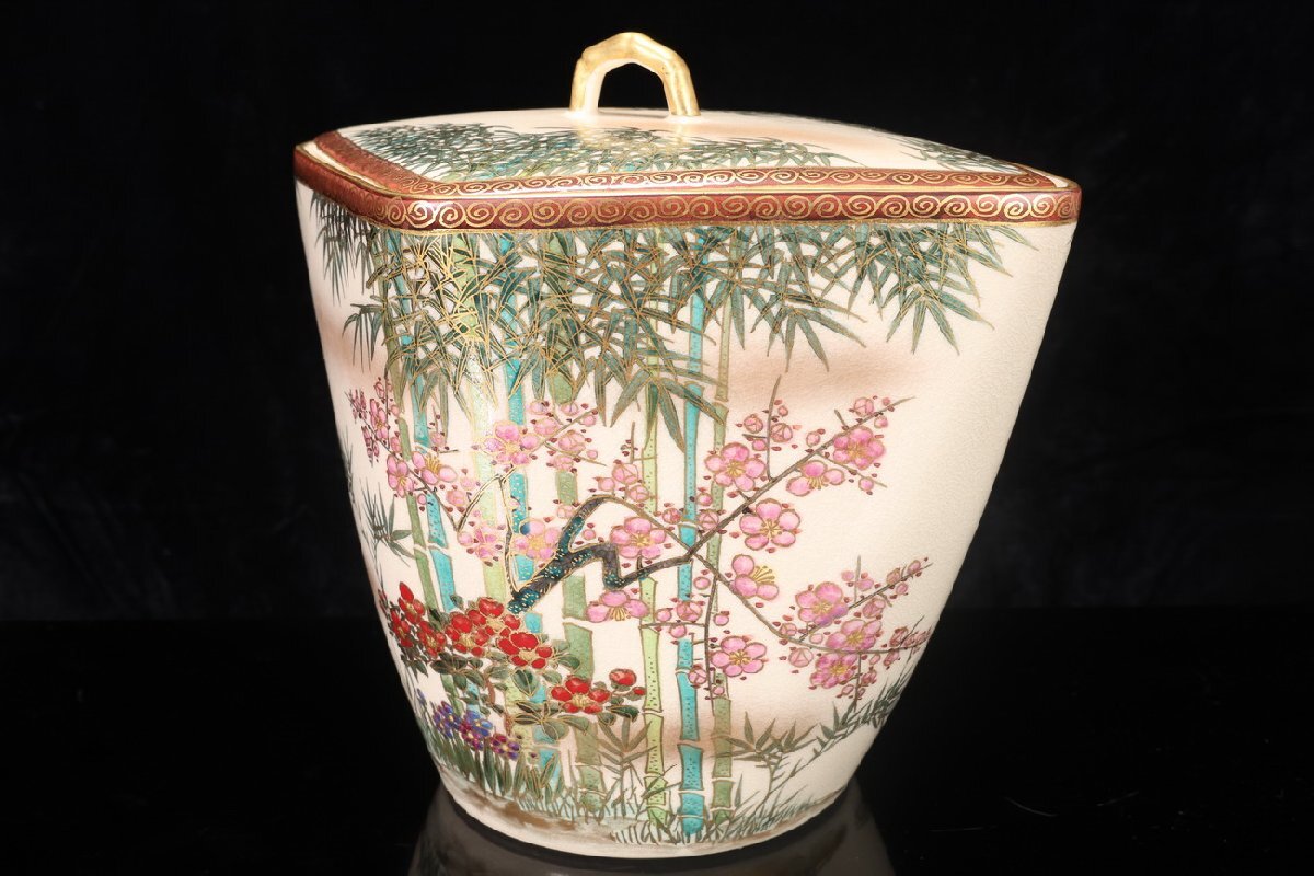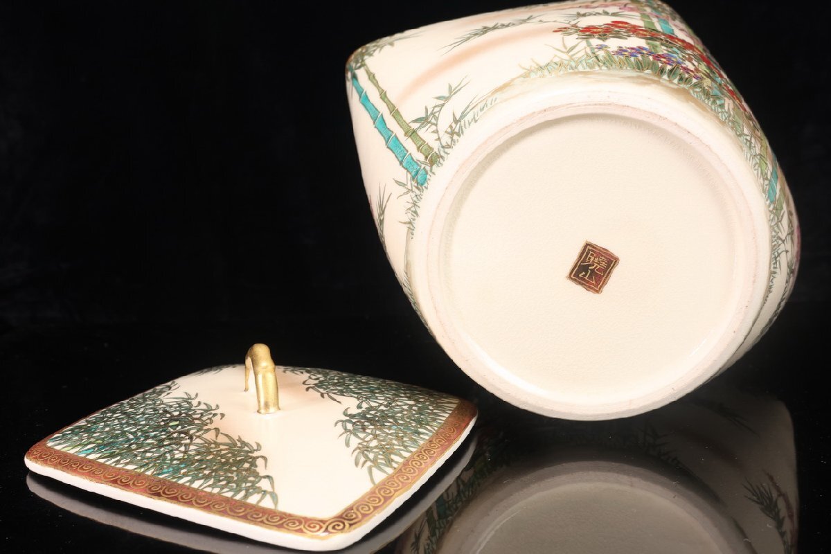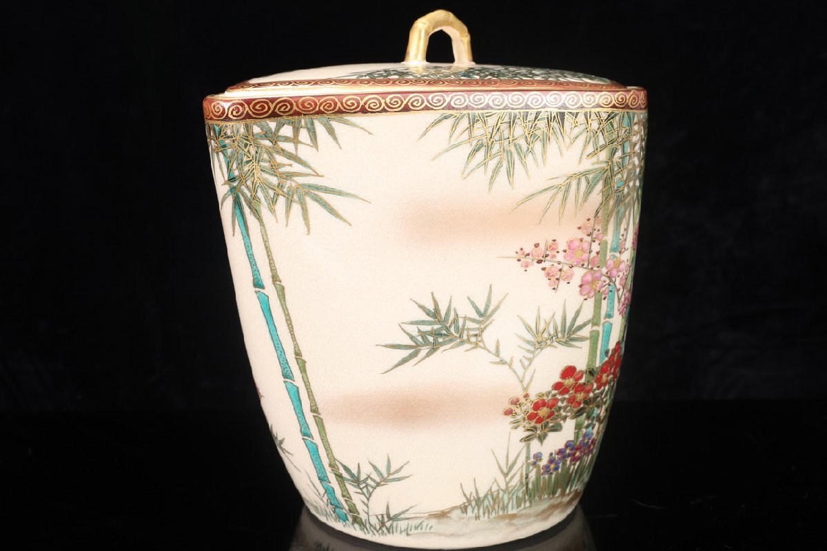 【珍品堂】1円から P80-V14 薩摩焼 薩摩菱 暁山 作 在銘 繊細 金彩 色絵 竹草花図 蓋付 水指 高20㎝ 絵花瓶 茶器 茶道具 共箱 木箱 骨董品