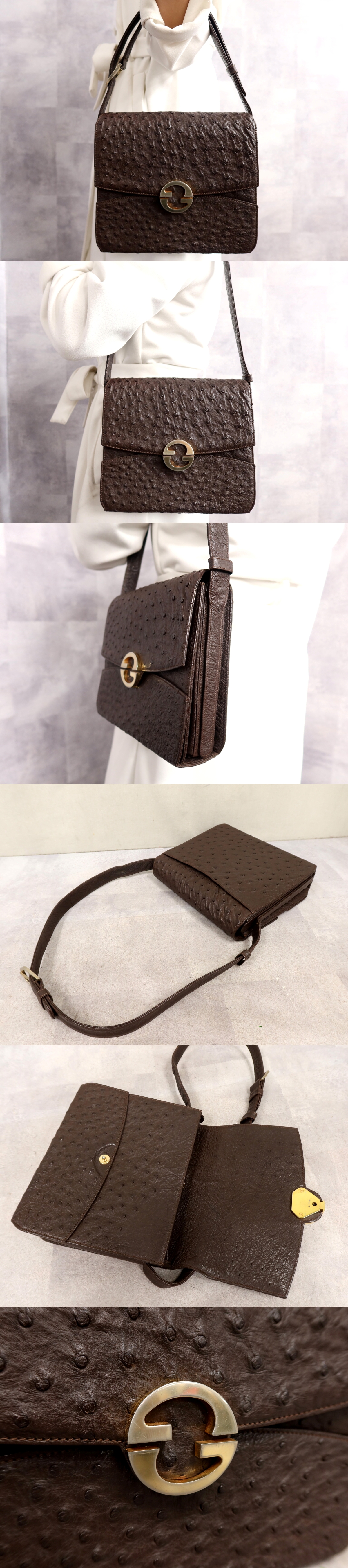 Store ●超美品●GUCCI オールド グッチ●オーストリッチ 本 ダチョウ 革●ショルダー バッグ●ダークブラウン●G金具●ヴィンテージ●Js64593