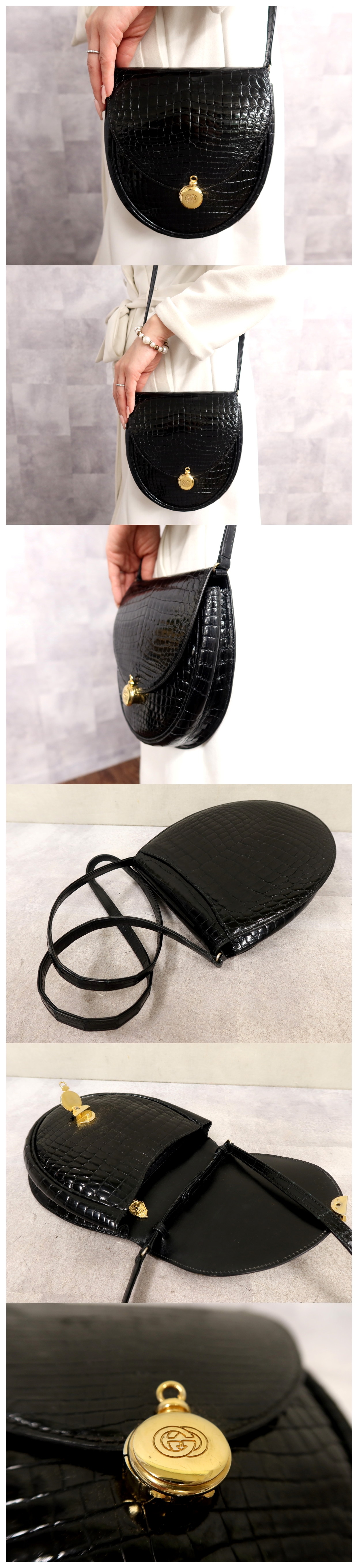 Store 超美品●GUCCI オールド グッチ●ロゴ金具●クロコダイル 本 ワニ 革●ショルダー バッグ●黒●G金具●イタリア製●ヴィンテージ●Js65094