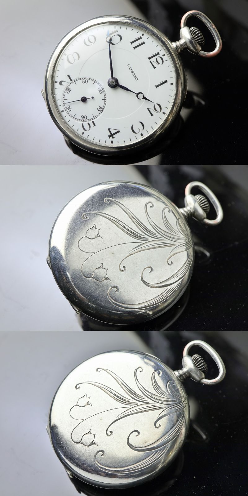 Product name: シーベル・ヘグナー商会 銀無垢 懐中時計 商館時計 和彫り 手彫り彫金 1919-1933年頃製 スズラン Cosmo