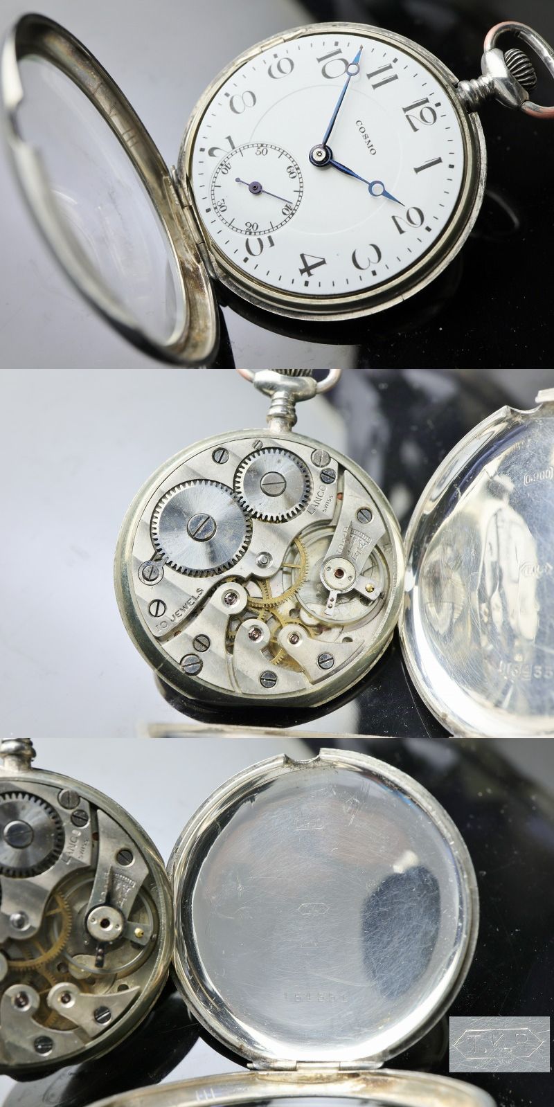 材質はCoinSilver(純度90%以上の銀無垢)、表蓋の開閉はヒンジ式でムーブメントの固定リングはスイングアウトタイプ(いわゆる専売側)のオープンフェイスケースです。