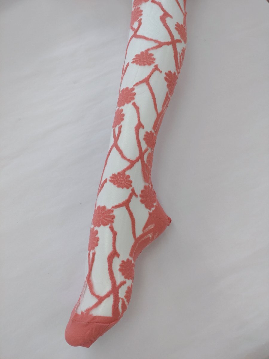 レディース タイツ シースルー フラワー ストッキング ストレッチ ML ピンク