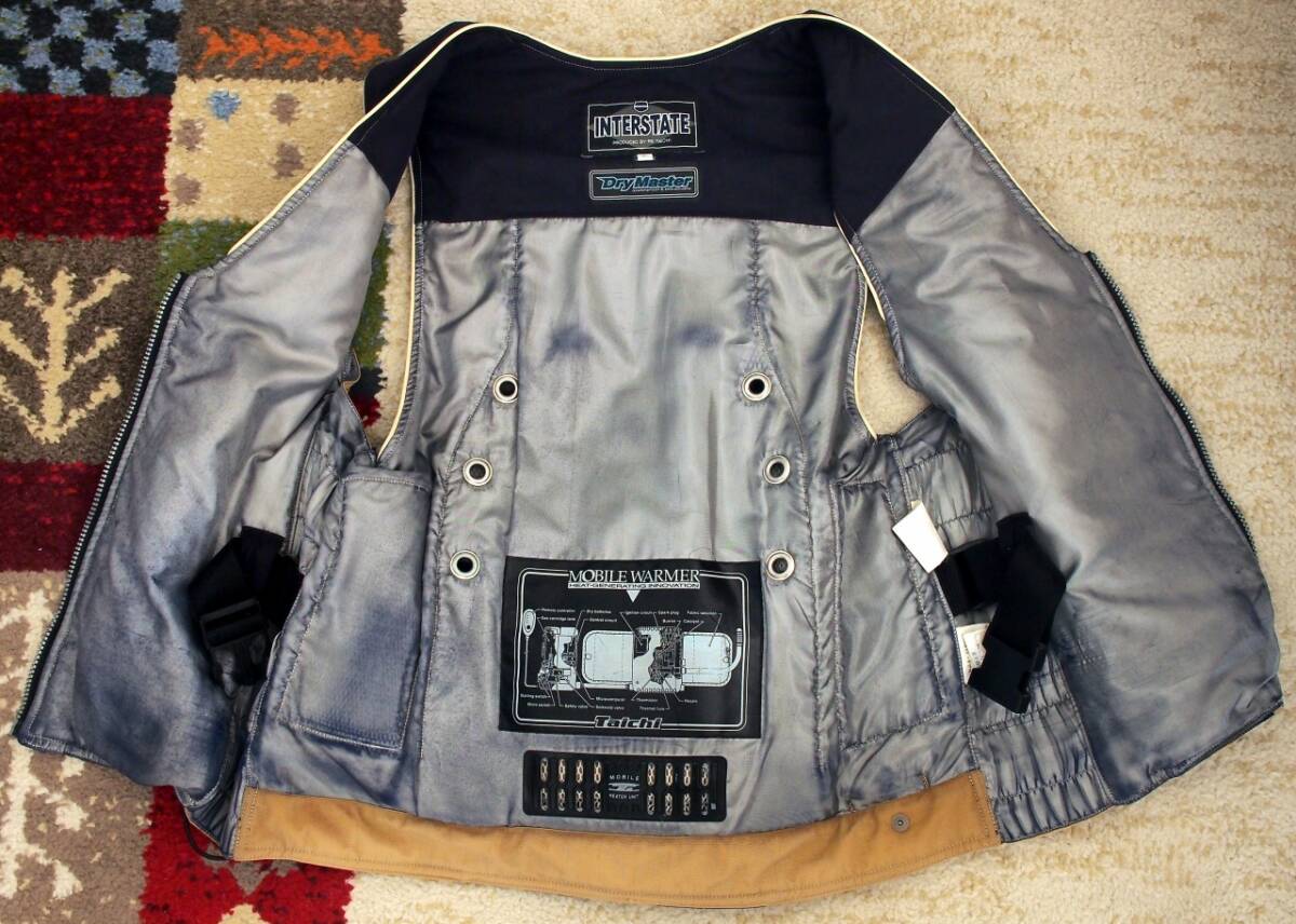 状態は古いものですので、色褪せや裏地のコーティングの剥げなどはありますが、暖めるユニット自体は問題ありません。ベストの上にジャケットを羽織るとかなり背中が暖かくなります。電気ベスト以上の暖かさはあると思います。ただ正面に熱源はないのであくまで背中中心になりますが。
