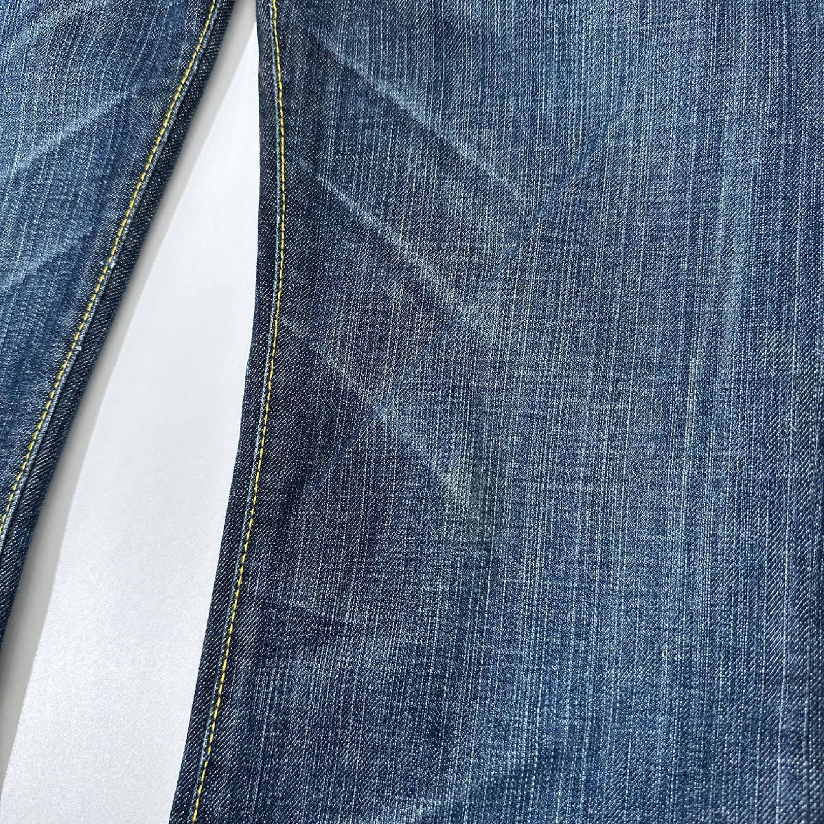 全体的に味のある色落ち、加工がされています。膝あたりにうすヨゴレがございます。