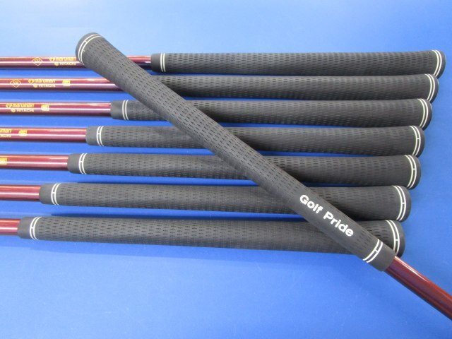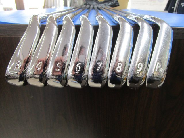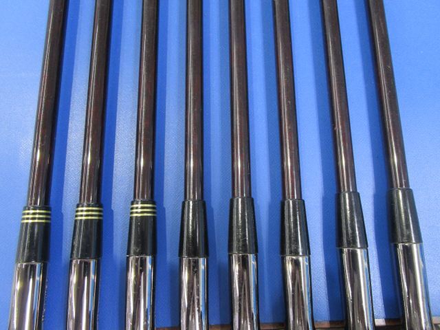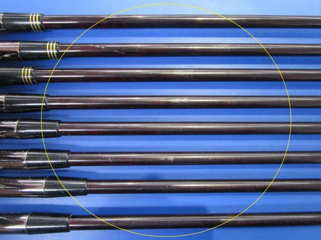 ◎USEDアイアン3-9・Pの8本セットです。3・4・5Iと6-9・Pが別のソケットです。PWに目立つ石噛み傷あります。シャフトに表面塗装欠け、擦れによる塗装落ち、線傷あります。グリップはツアーベルベッドラバーですが硬化と擦り減りあります。ソールに擦り傷、フェースに打球痕、当たり傷があります。使用に伴う細かな傷がございます。重量・バランスは7Iでの計測です。