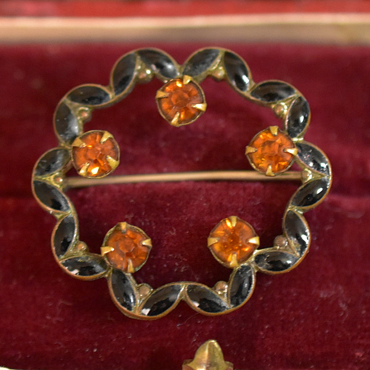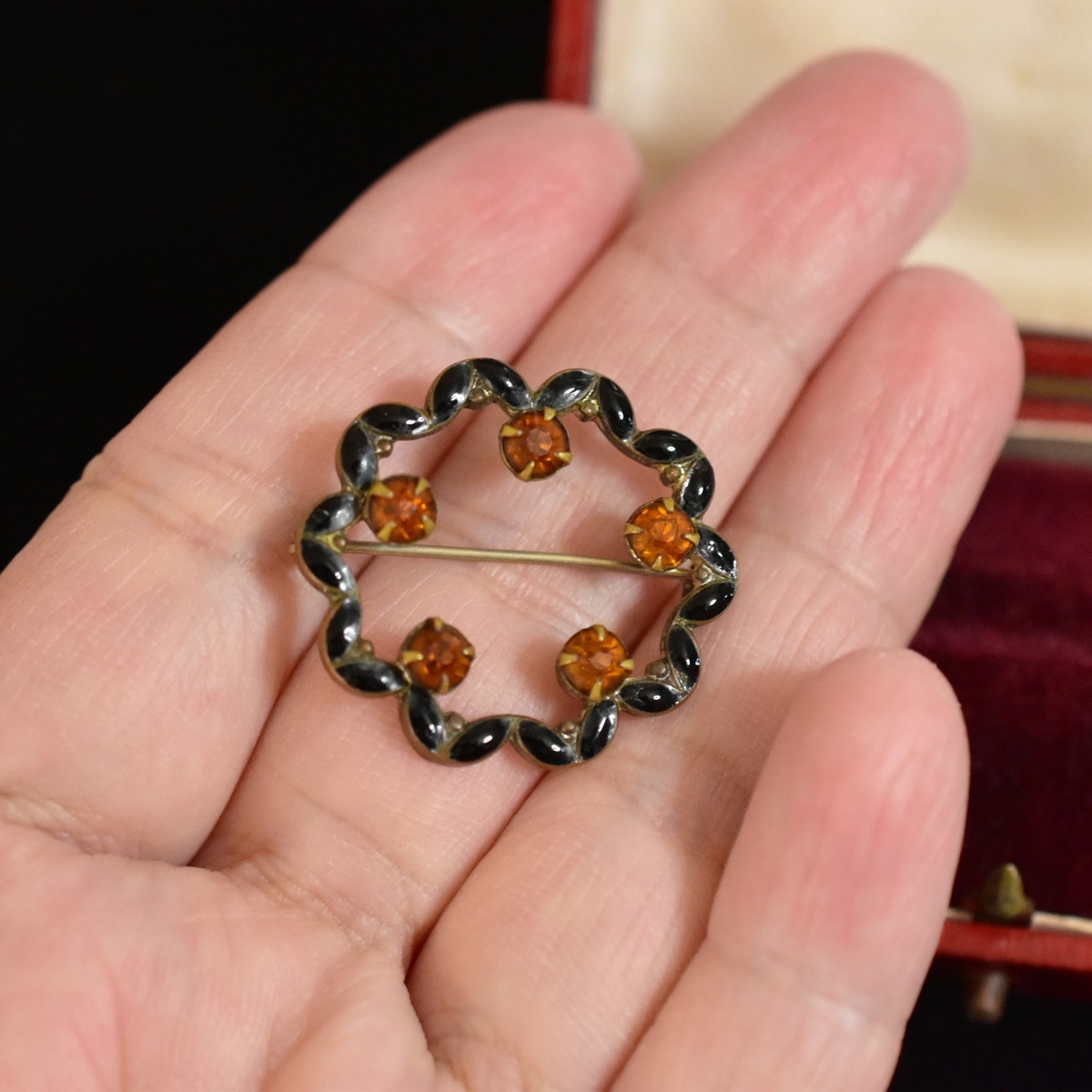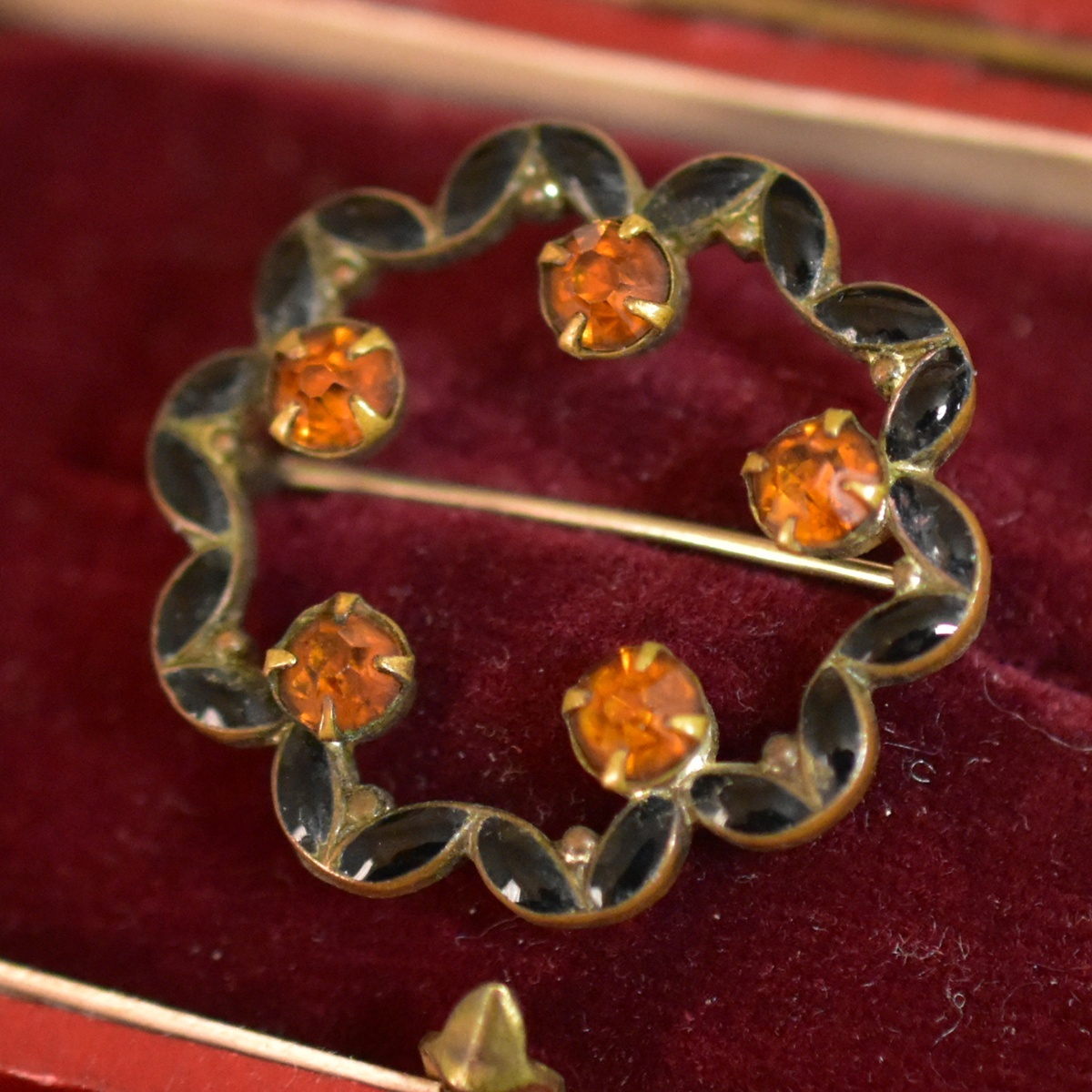 Product name: アンティーク 黒エナメル/七宝とシトリン色ラインストーンのブローチ 状態良好 本物保証
