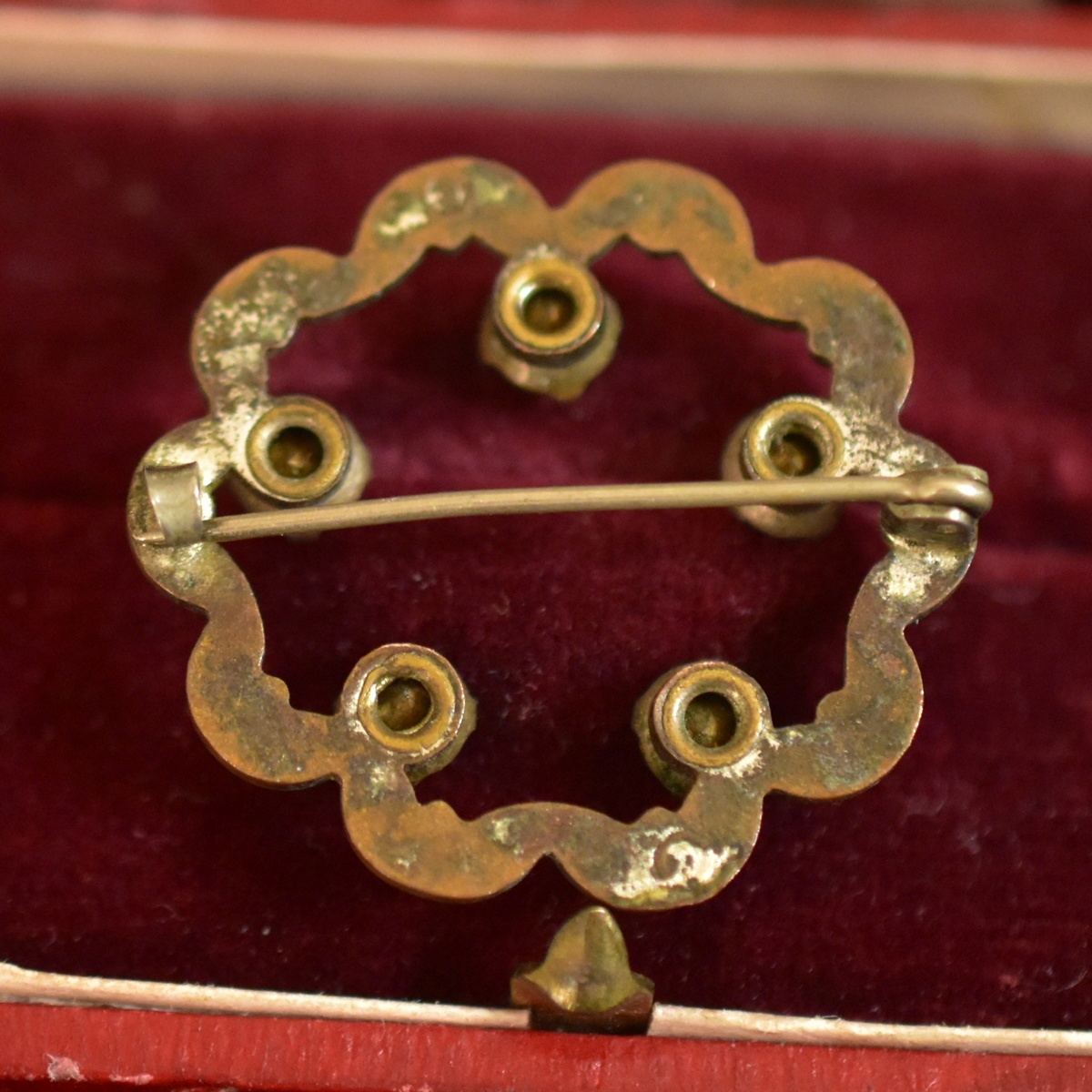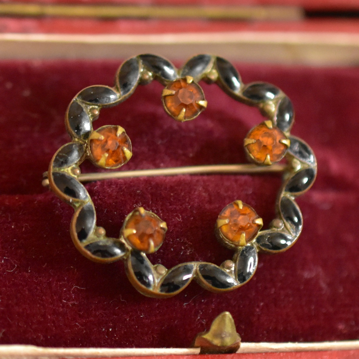 アンティーク 黒エナメル/七宝とシトリン色ラインストーンのブローチ 状態良好 本物保証