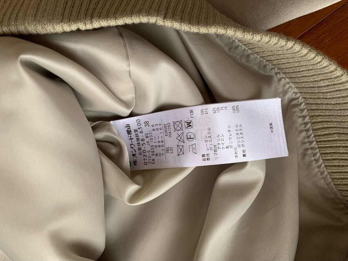 [表地]レーヨン:59%、ポリエステル:41%[リブ部分]アクリル:82%、ナイロン:10%、毛:7%、ポリウレタン:1%[中わた]ポリエステル:100%[裏地]ポリエステル:100%