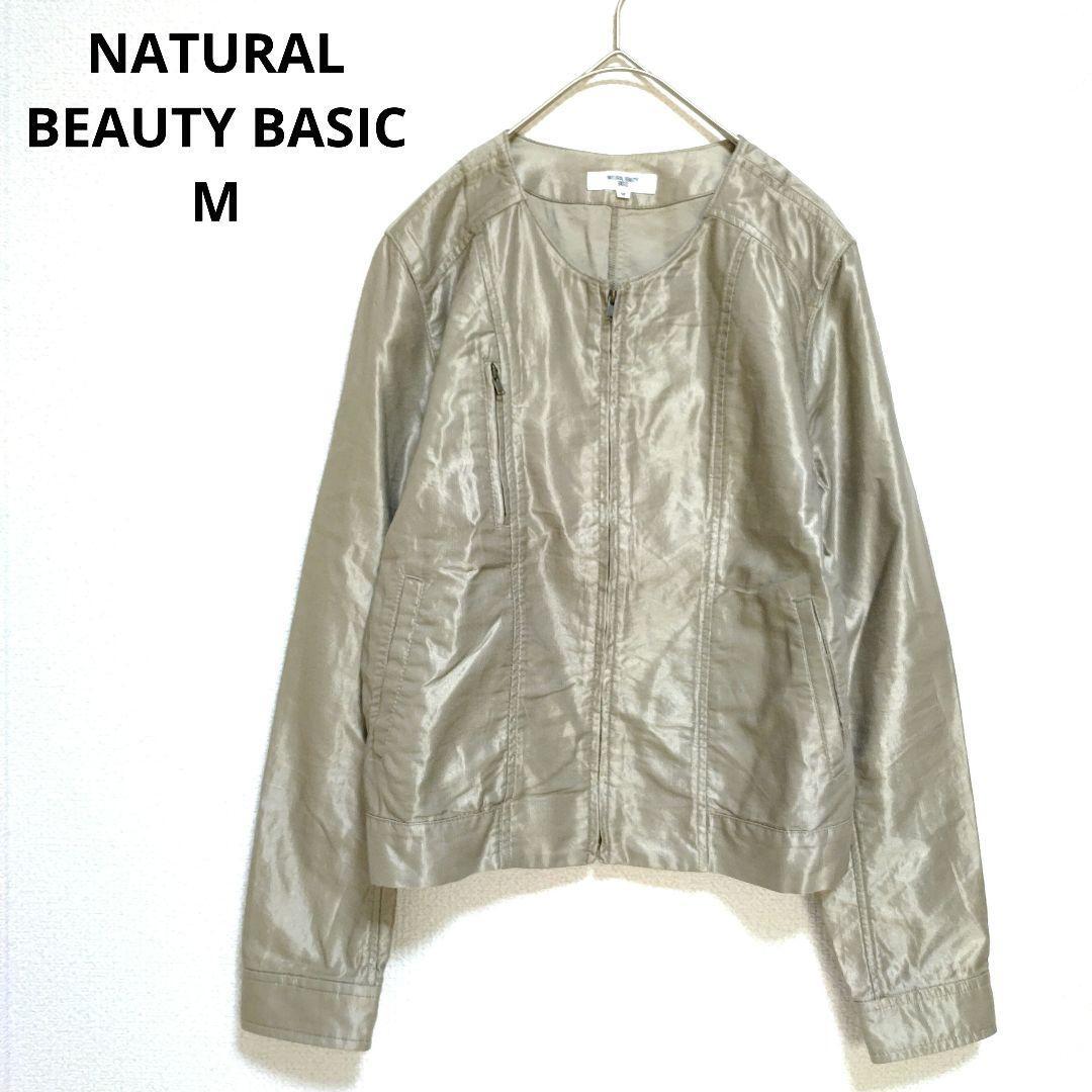 NATURAL BEAUTY BASIC ナチュラルビューティーベーシック ジャケット ノーカラー ライダース風 光沢感 銀 シルバー M