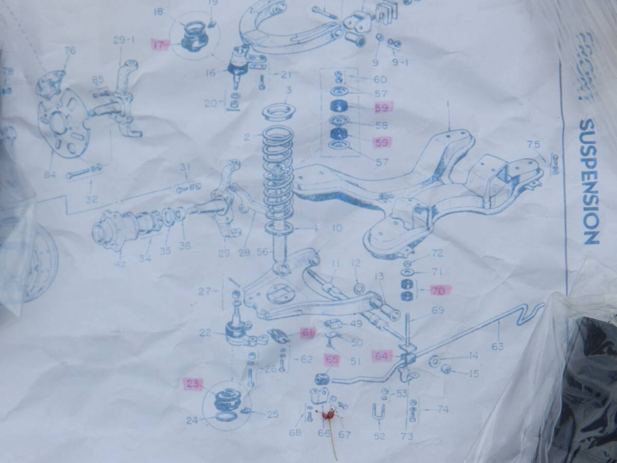 いすゞ ベレット フロントサスペンション ラバー ブッシュ等パーツリスト赤印のパーツになります。17番9-51229231-02個。23番5-51229007-02個。59番9-51631603-04個。61番0-51682101-02個。64番9-51779035-02個。65番9-51879053-02個。70番9-51779049-04個。コンデションは画像で判断してください。御約束の3N厳守でお願いいたします。