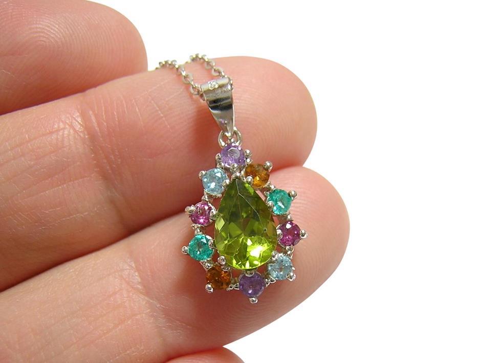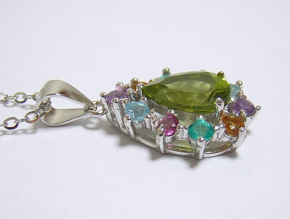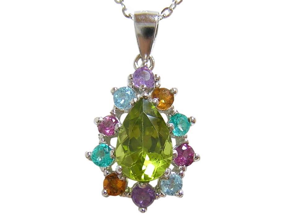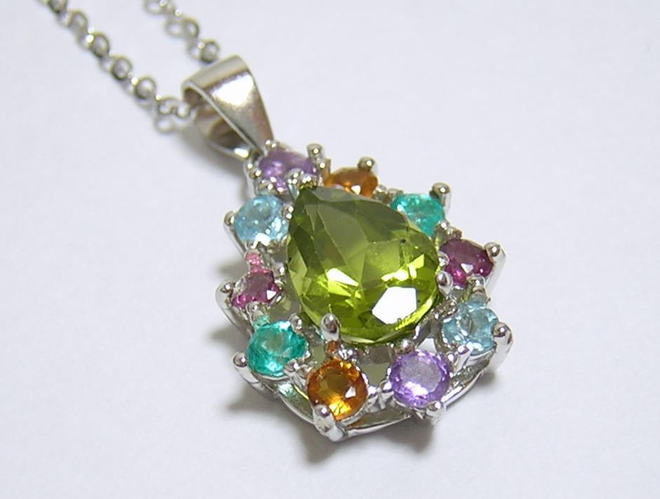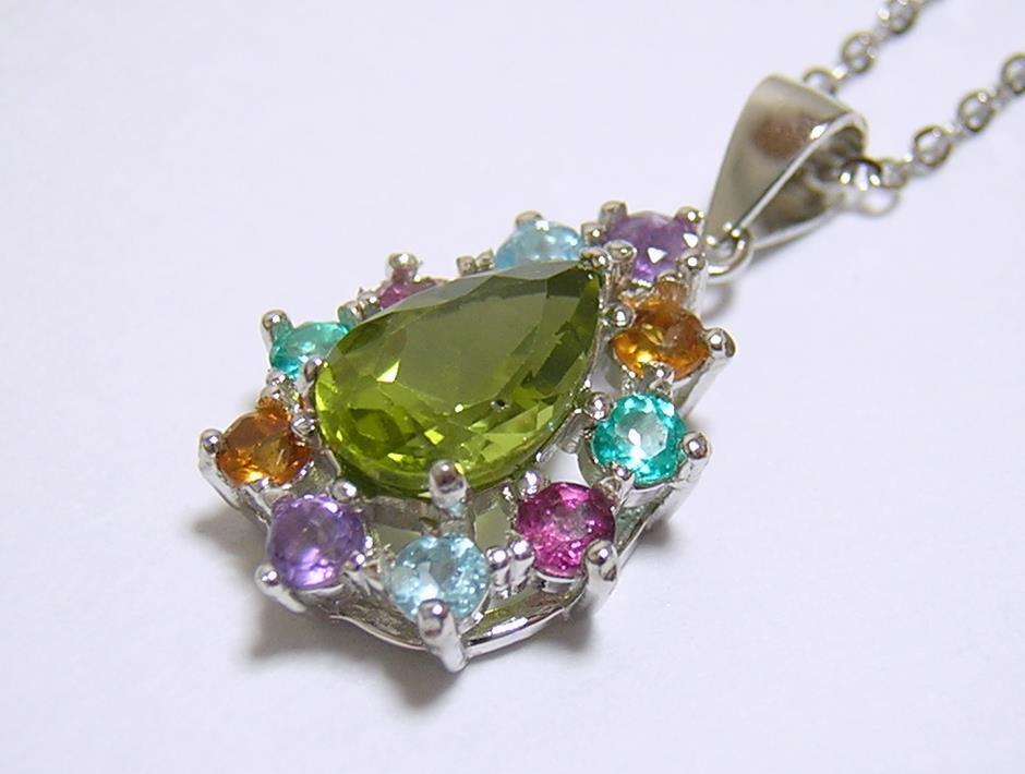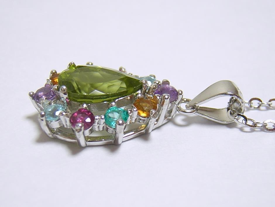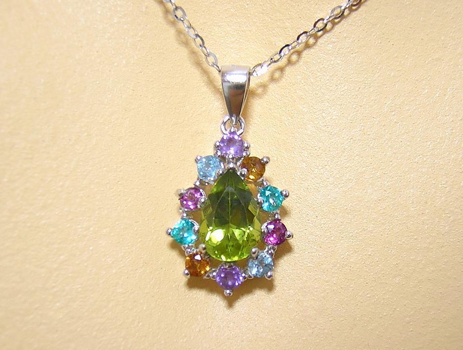天然ペリドットとアメジスト、シトリン、トパーズ、ロードライトガーネット、ブルートパーズを使用したペンダントネックレスです。 ペリドットの大きさは約9×6mmです。