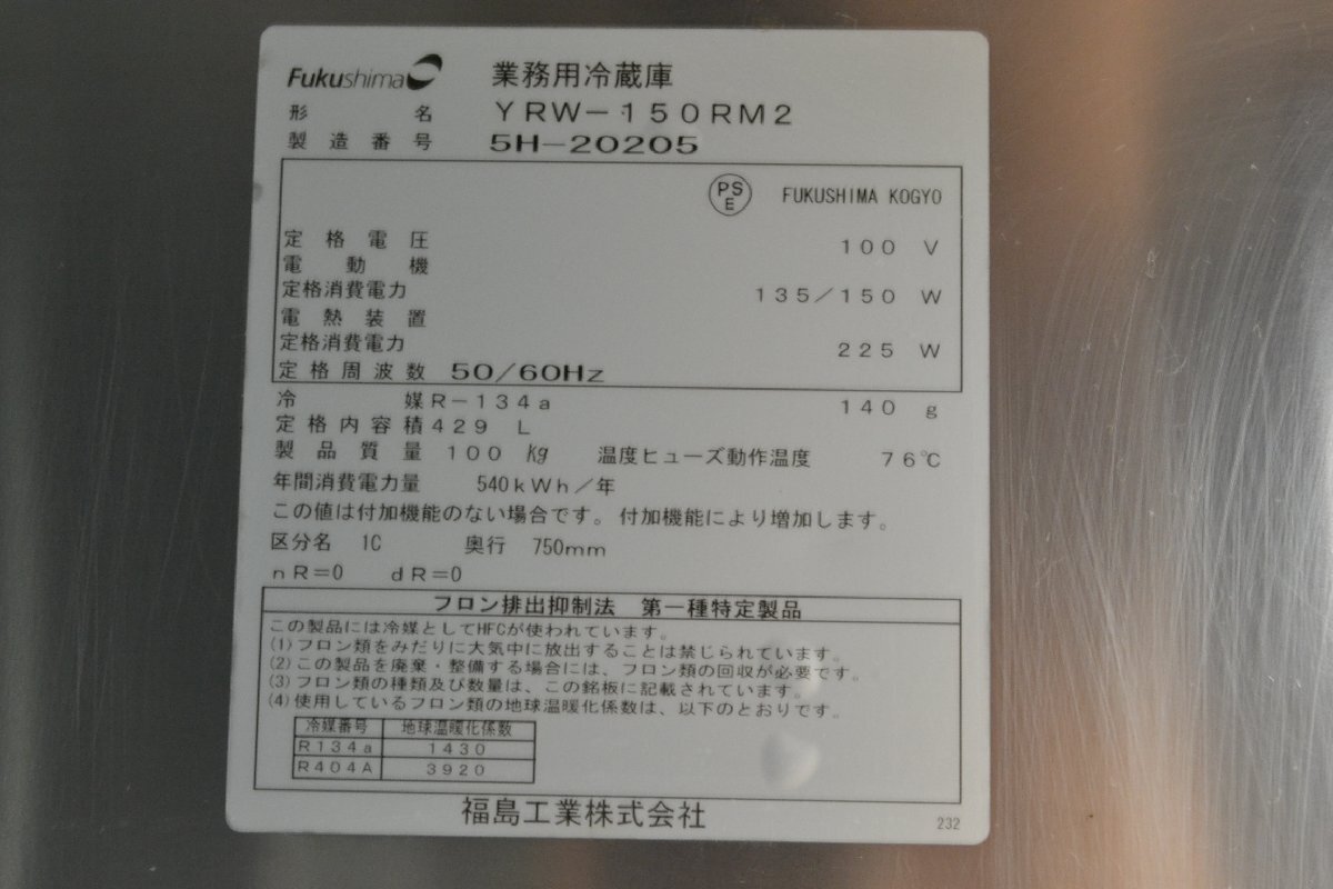 C2222■FUKUSHIMA フクシマ■台下冷蔵庫 コールドテーブル■YRW-150RM2■2015年製■センターピラーレス