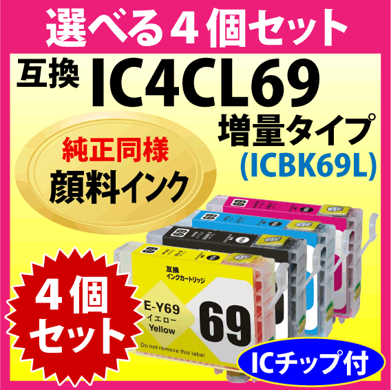 エプソン IC4CL69(IC4CL69L)内訳:ICBK69/ICC69/ICM69/ICY69互換インク(ブラックは増量タイプのICBK69L)の中から4個選択してください。
