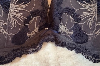 ブラは少々ラメ入りのお花模様のおしゃれなレース、中央に飾りパールとリボン、2段3列フック、